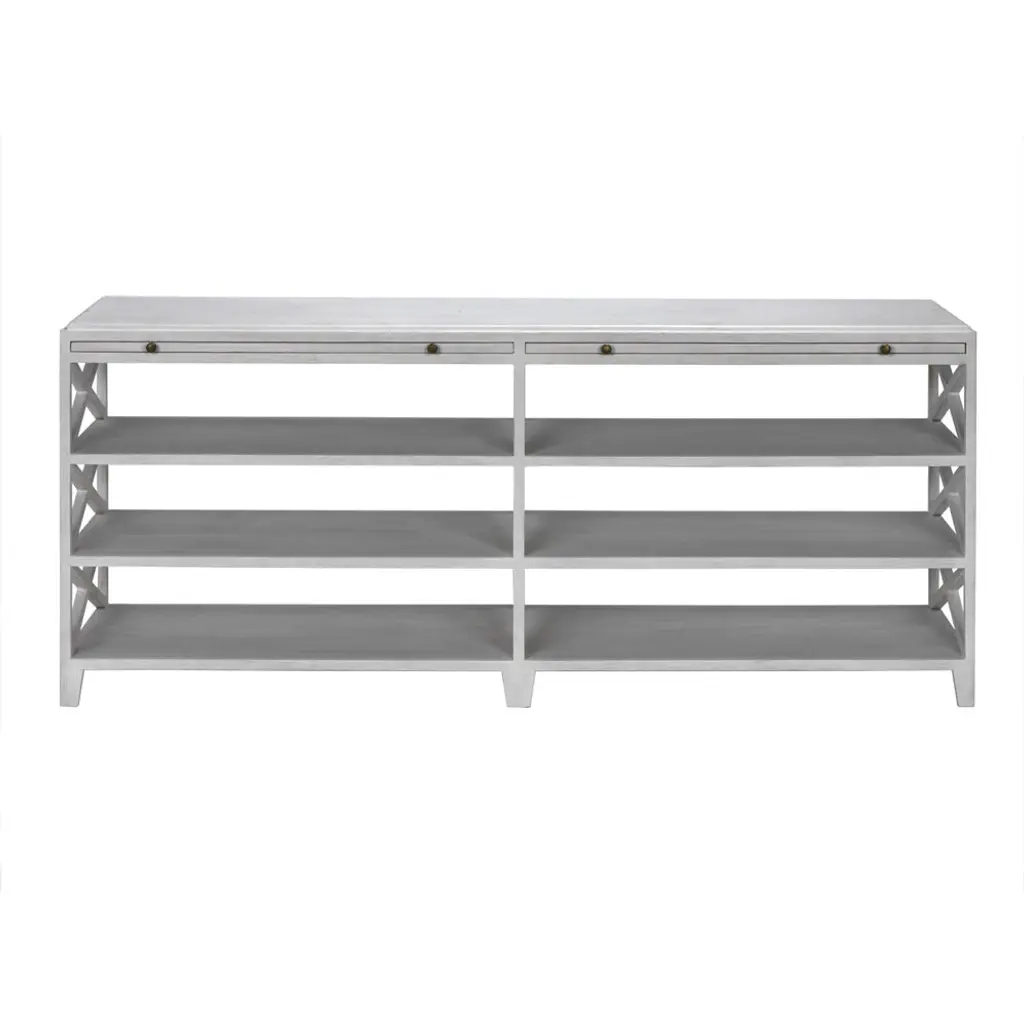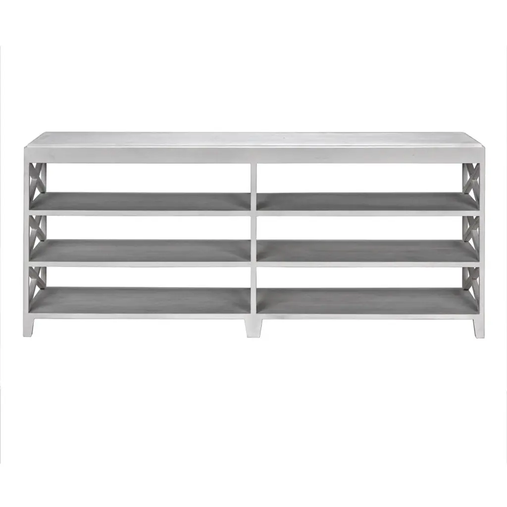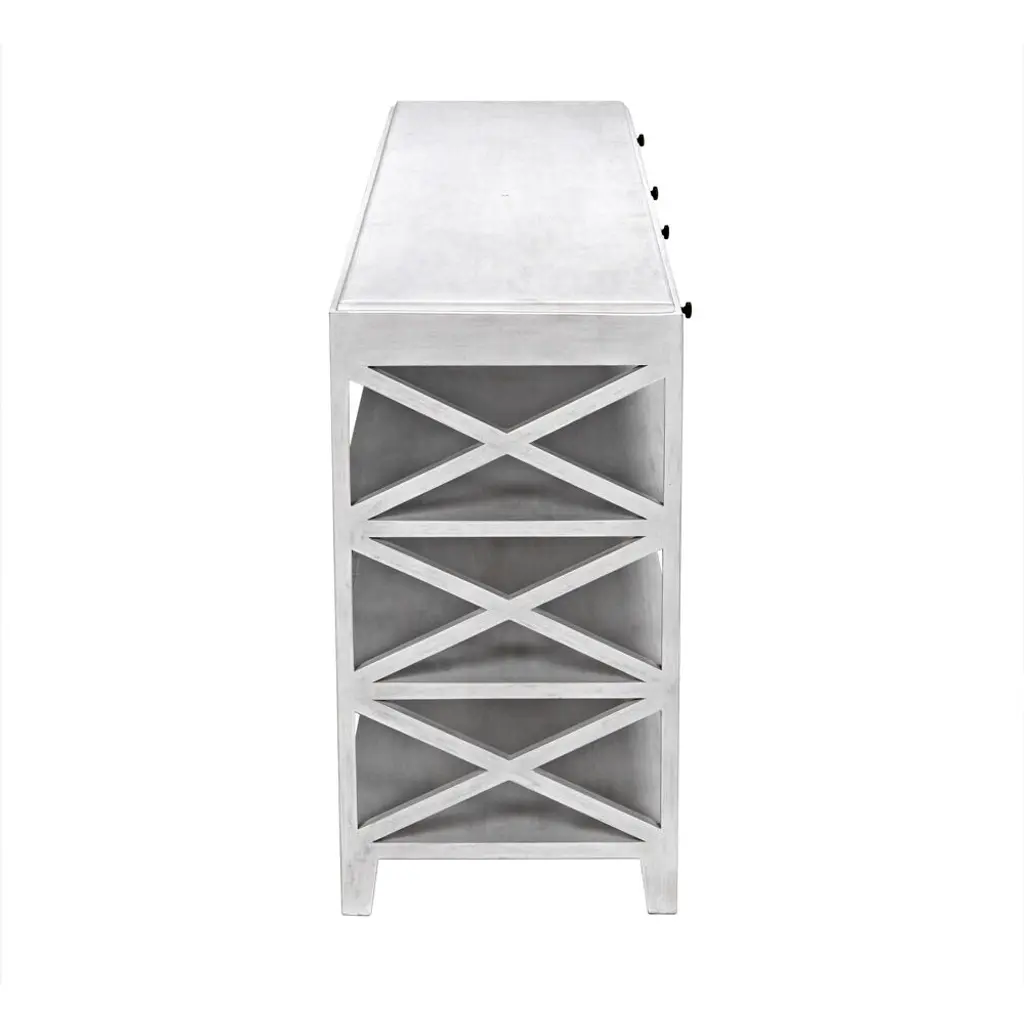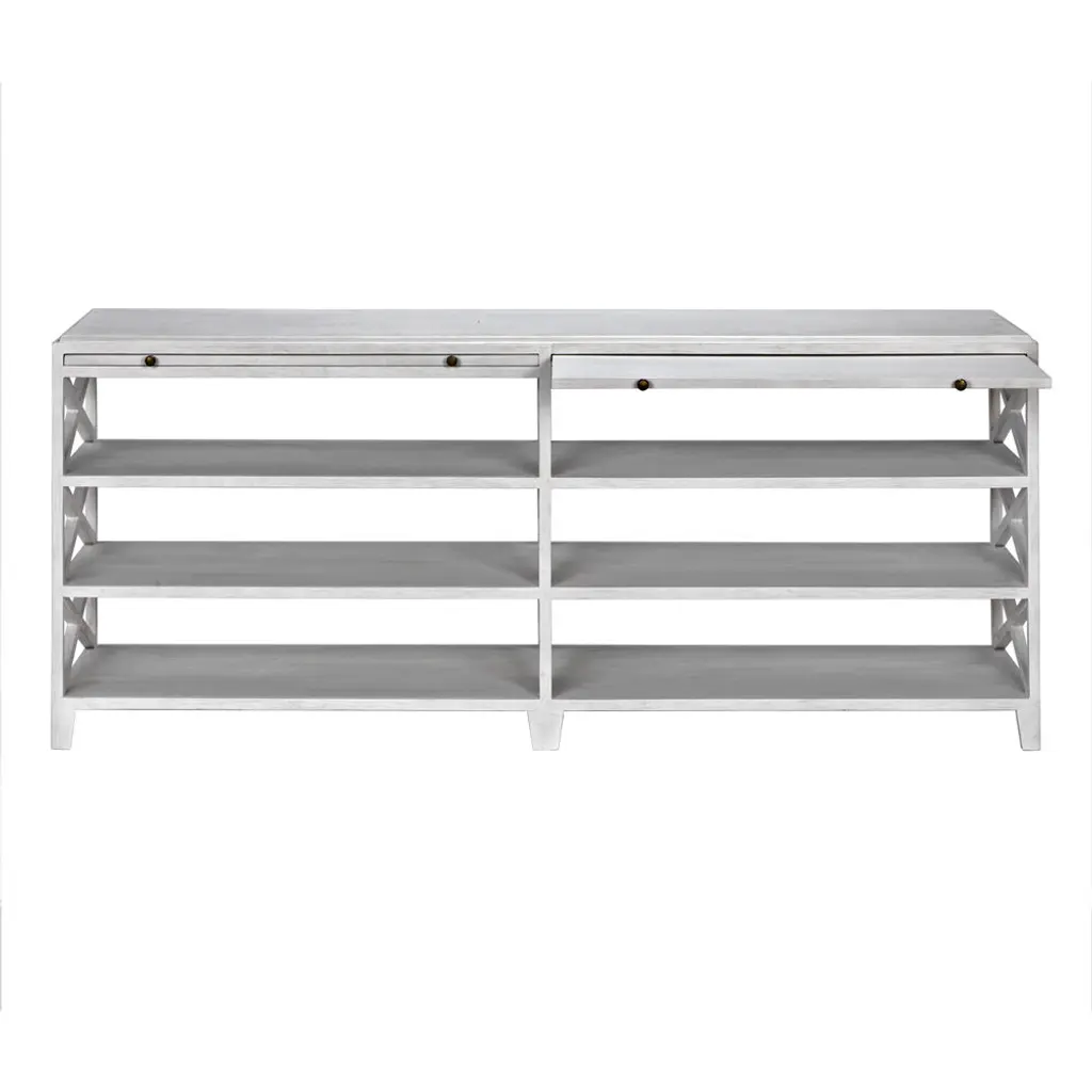 This sophisticated yet simple side console has been hand-carved of solid mahogany, and finished by hand with a hand rubbed black or a soft whitewash. Its many features include four generously sized shelves, striking carved repeating "X" embellishments, and a sliding tray that provides extra space.