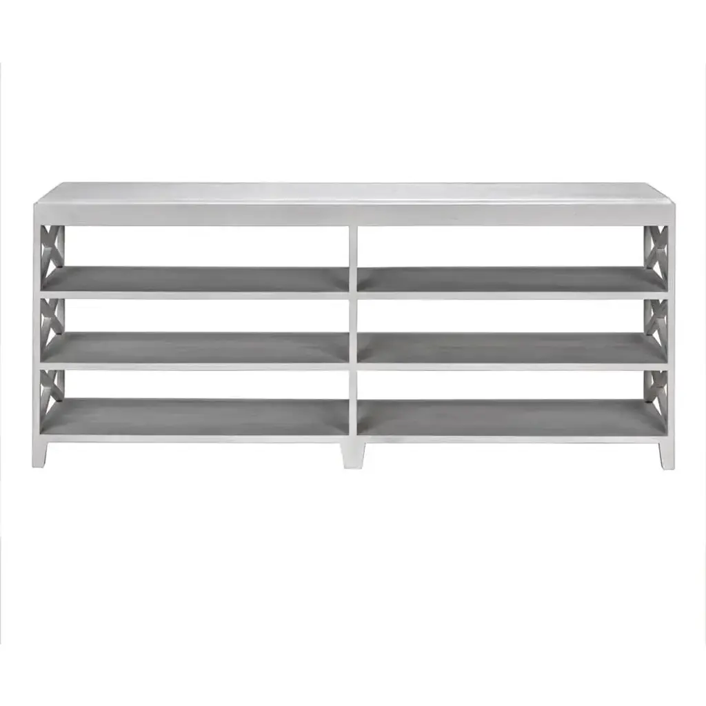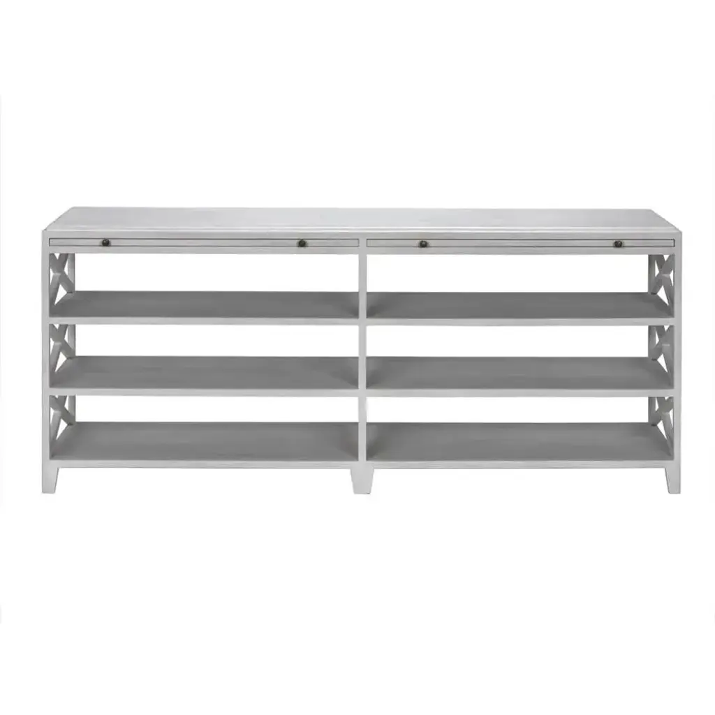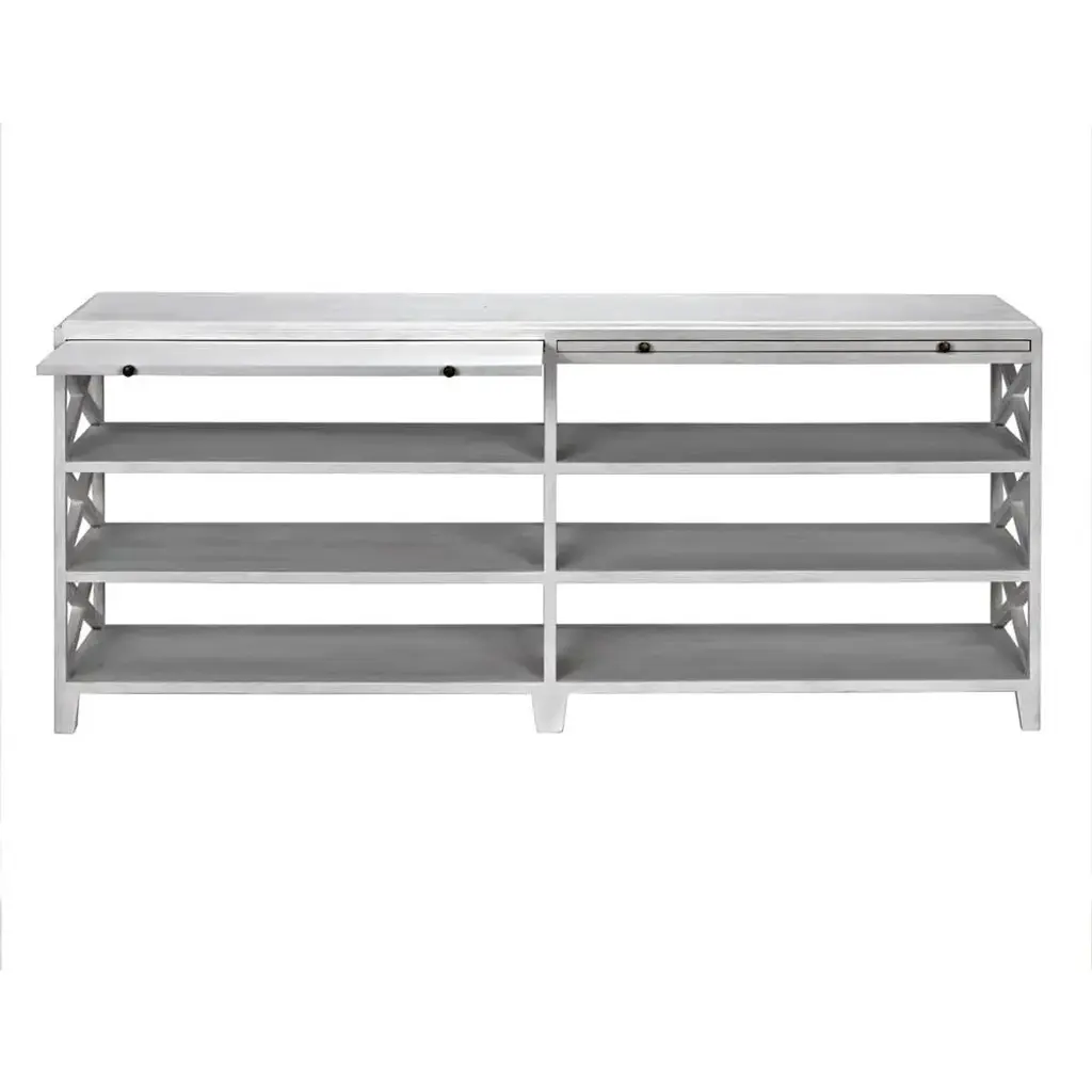 This sophisticated yet simple side console has been hand-carved of solid mahogany, and finished by hand with a hand rubbed black or a soft whitewash. Its many features include four generously sized shelves, striking carved repeating "X" embellishments, and a sliding tray that provides extra space.