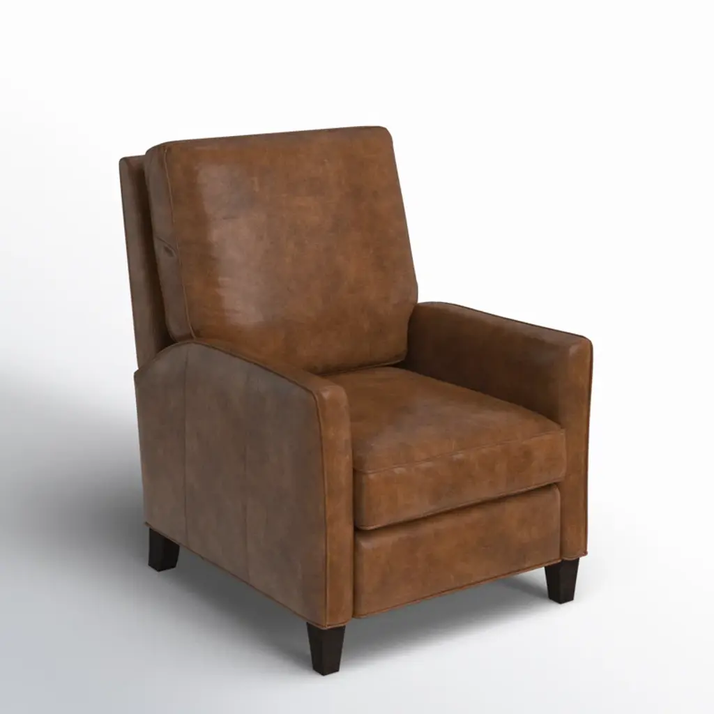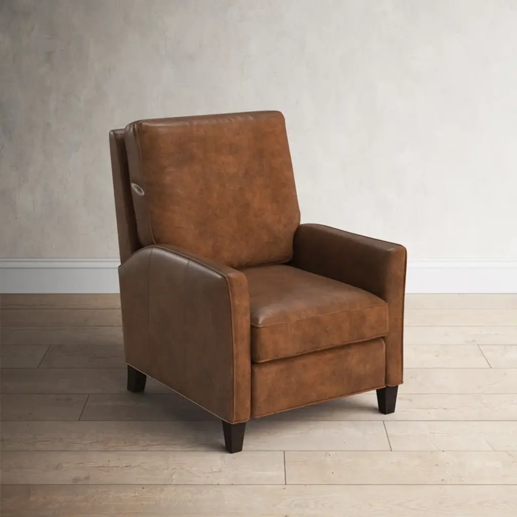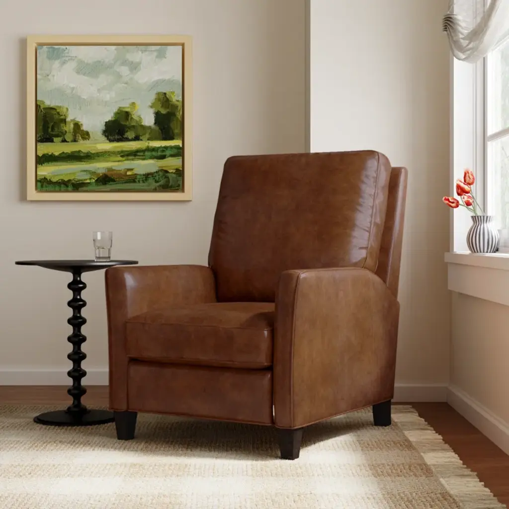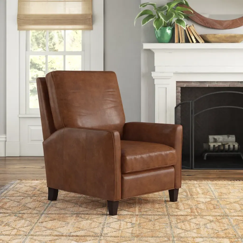 This recliner is upholstered with golden brown genuine leather for a classic and elegant look. Plus, it's easy to wipe clean with a dry cloth – so don't worry if that post-dinner cherry cobbler spills. We love how its classic flared arms, straight back, and tapered feet blend in with your other traditional furniture. Its seat cushion is filled with fiber-wrapped foam and supported by sinuous springs to keep you comfortable during family movie night. And reclining couldn't be easier: All you need to do is push back.