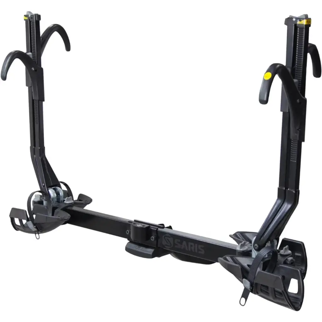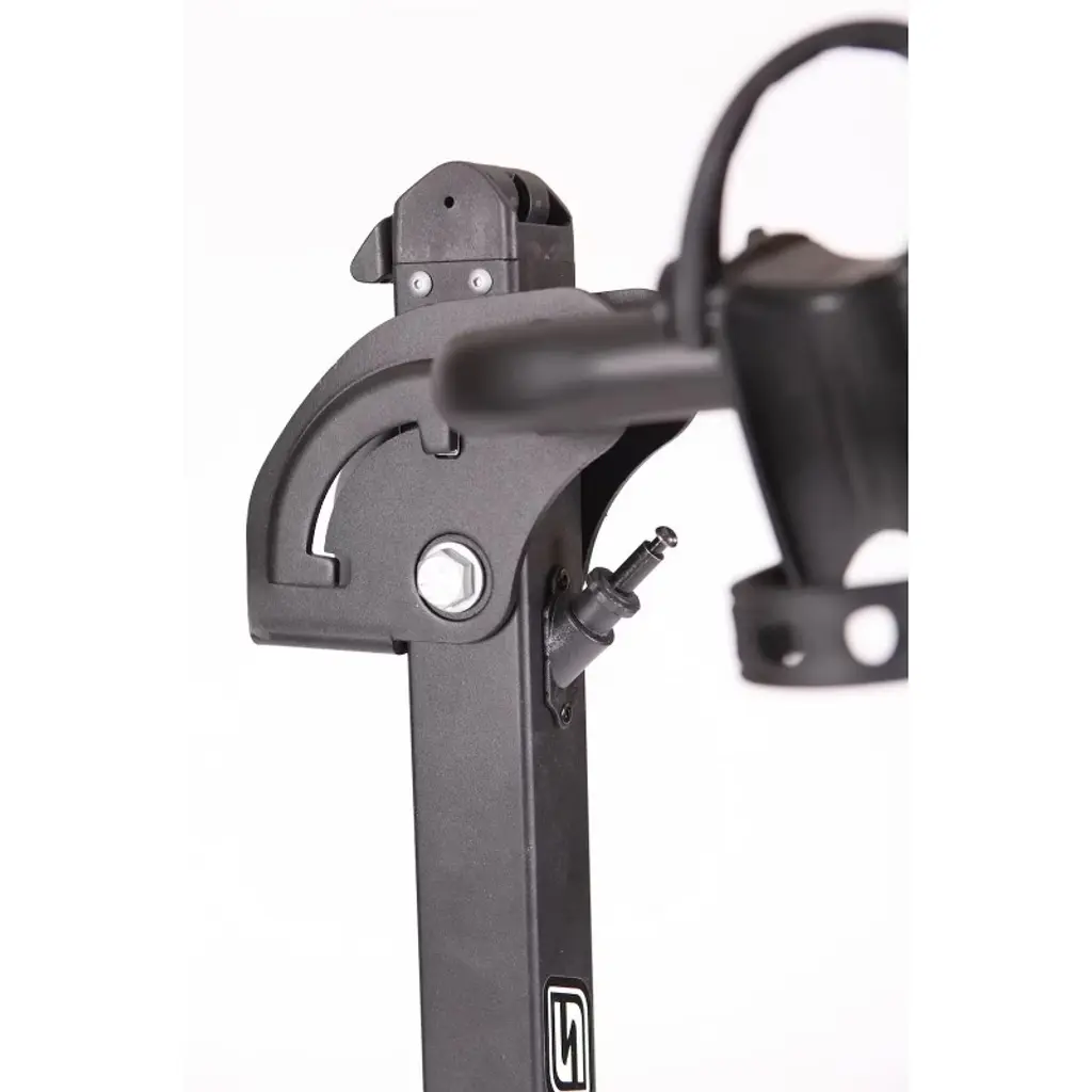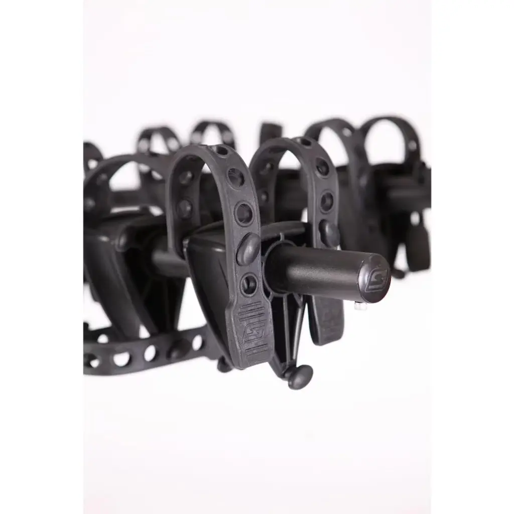 The Swagman TITAN 4 is a user friendly, lightweight hitch mount hanging bike rack perfect for occasional use. Building upon our popular Trailhead series, it has added features that make it even easier and more convenient to use. The TITAN 4 carries four bikes of most styles and sizes, with a maximum weight of 35lbs per bike. Anti-sway cradles help prevent contact between bikes. Releasing the cam lever collapses the arms and tilts the rack back for easy access to your trunk. An integrated locking cable helps to secure your bikes to the rack.