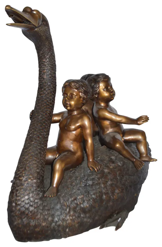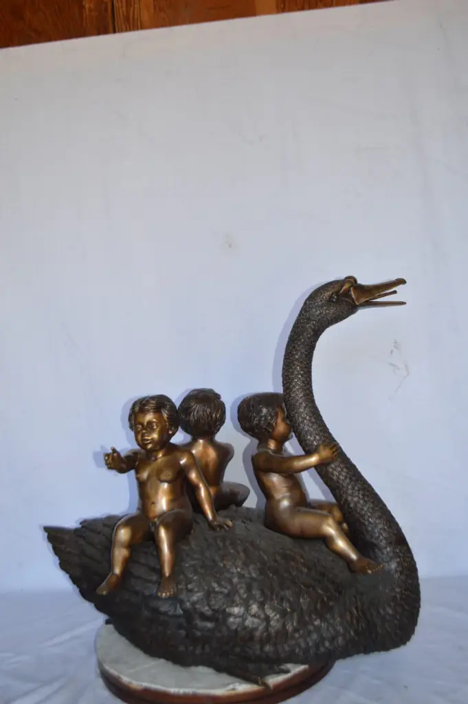 Surprise your garden guests with this giant size outdoor/indoor Bronze fountain Statue of a swan, with three naked angels - boys. The swan is equipped with a hose that sprays water out of his mouth, with the use of a fountain pump (pump is not included). Produced using superior quality bronze and a traditional casting method that yields pristine details. The patina chosen for this Timeless Creation is stained in natural bronze and brown patina finish for preservation. This impressive Bronze Statue will be a permanent fixture on the grounds of your estate for years to come. Size: 40"L x 23"W x 34"H. Weight is: 105Lb