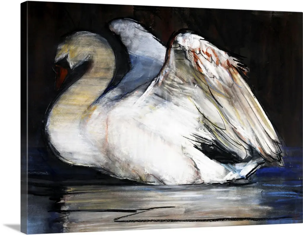 Graceful white swans are distinguished against a dark backdrop. Canvas is mounted in a warm silver floater frame with satin black side.