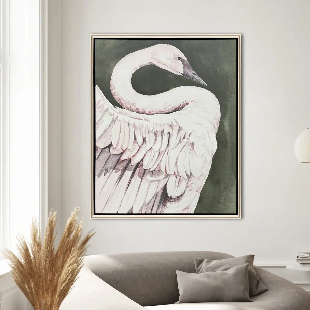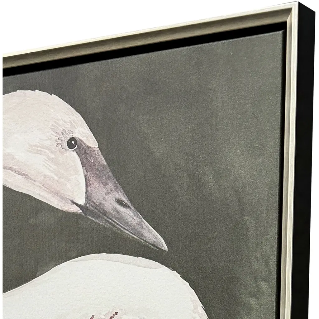 Graceful white swans are distinguished against a dark backdrop. Canvas is mounted in a warm silver floater frame with satin black side.