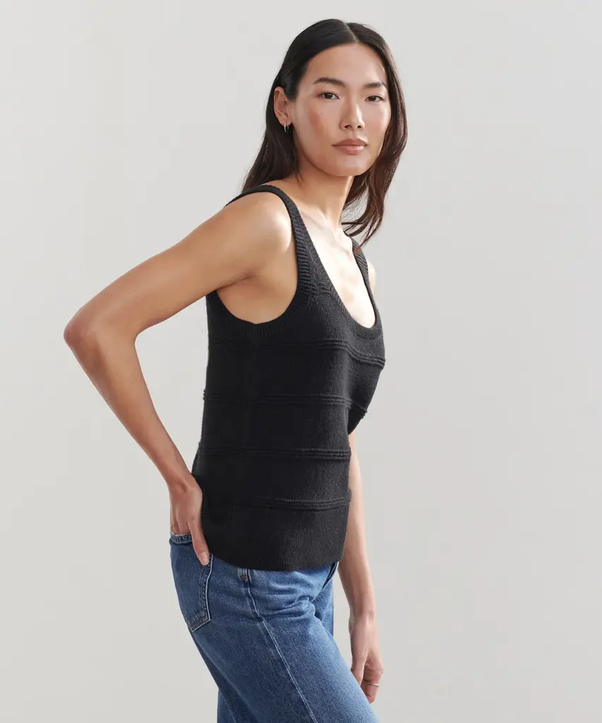 Sweater Tank BlackIn 100% luxe cotton, this woven take on an everyday staple brings an elevated air to your rotation of basics.Features subtle, textured stripe detailing.100% cotton.Made in Peru.Classic-fit tank with a slight crop.