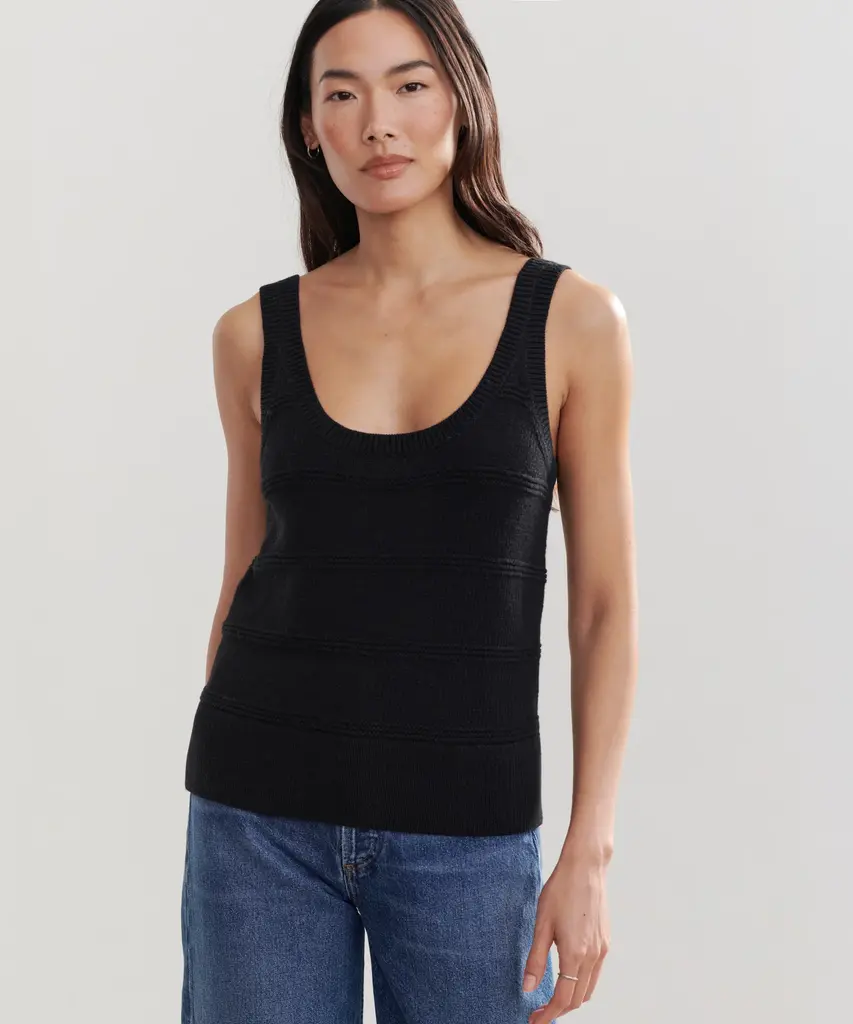 Sweater Tank BlackIn 100% luxe cotton, this woven take on an everyday staple brings an elevated air to your rotation of basics.Features subtle, textured stripe detailing.100% cotton.Made in Peru.Classic-fit tank with a slight crop.