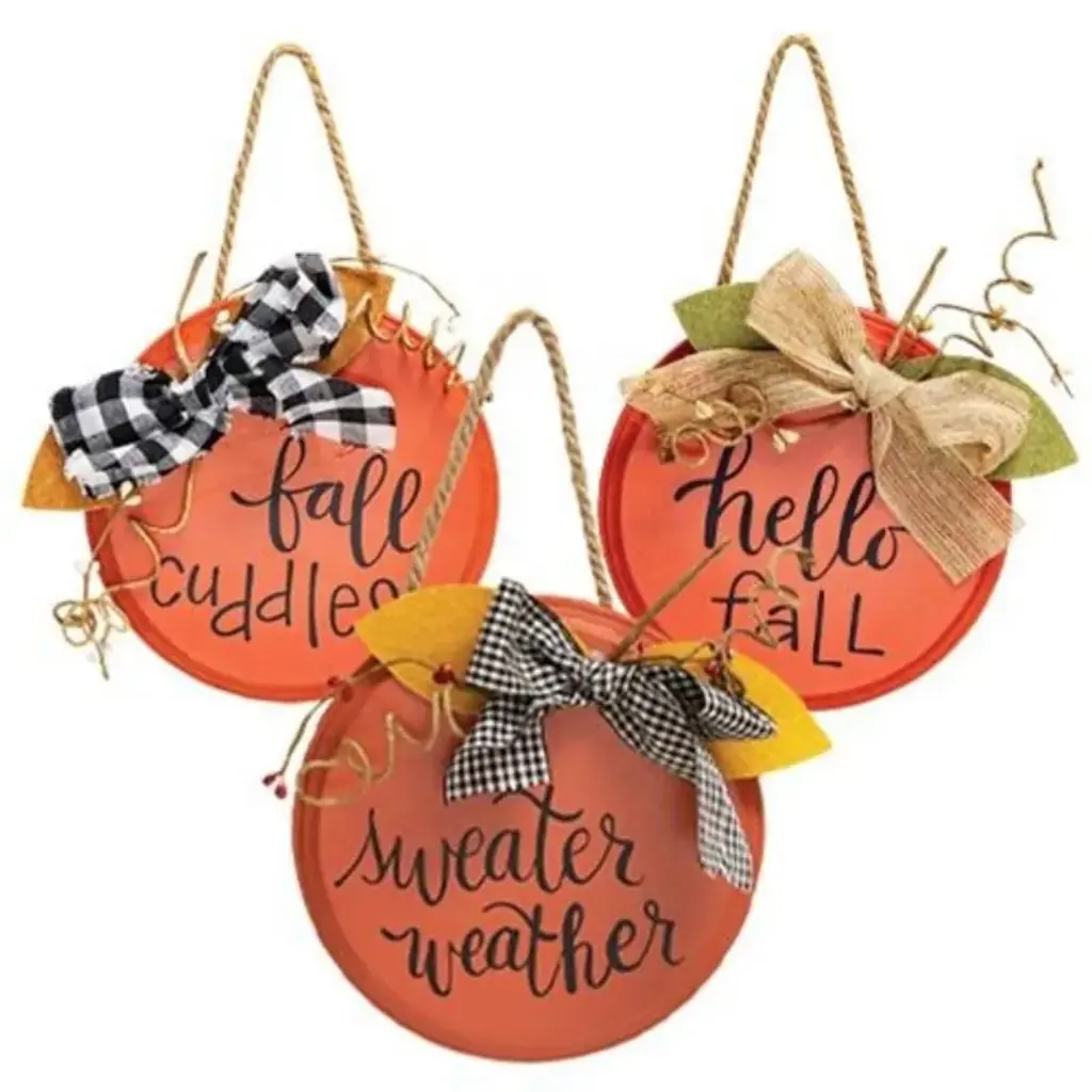 Sweater Weather Round Hanging Sign With Burlap Bow 3 Assorted - H - 6.50 In. W- 0.75 In. L - 6.50 In. - Orange