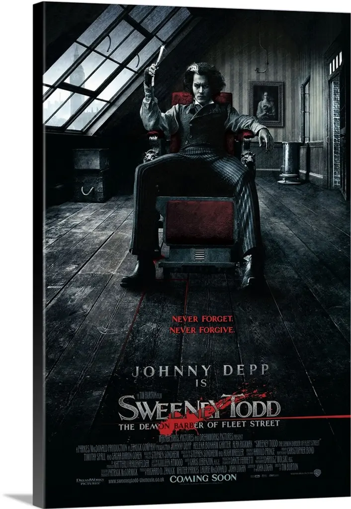 After hard years in exile for a crime he didn't commit, Benjamin Barker, now Sweeney Todd, returns to London to find his wife dead and his daughter in the hands of the evil Judge Turpin. In his anger, Sweeney goes on a murderous rampage on all London. With the help of Mrs. Lovett, he opens a barber shop in which he lures his victims with a charming smile before casually ending their lives with a flick of his razor across their necks. But not one man nor ten thousand men killed can satisfy Sweeney's lust for vengeance on those who've caused his years of pain.