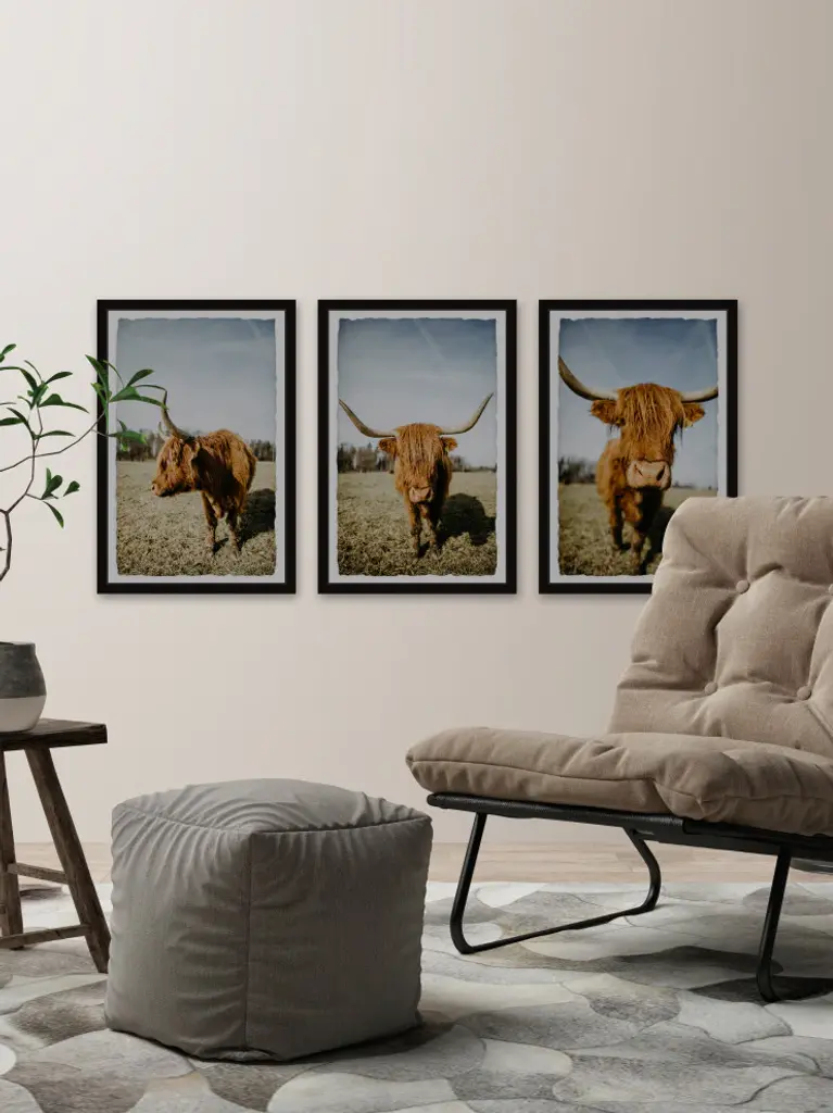 Bring a western feeling to your space with these three photographic prints that feature an ox in a sunny, grassy field. Proudly printed in the USA, this piece is printed on high quality archive paper and professionally hand-framed. With wall-mounting hooks included, this artful accent is ready to hang up as soon as it reaches your front door.- (3) panels of 12x18- Top quality Giclee print on high resolution Archive Paper- Hand cut deckled edges- High quality durable non-warping frame- Finished under shatter resistant plexiglass- Arrives ready to hang- Includes a certificate of authenticity- Printed in the USA