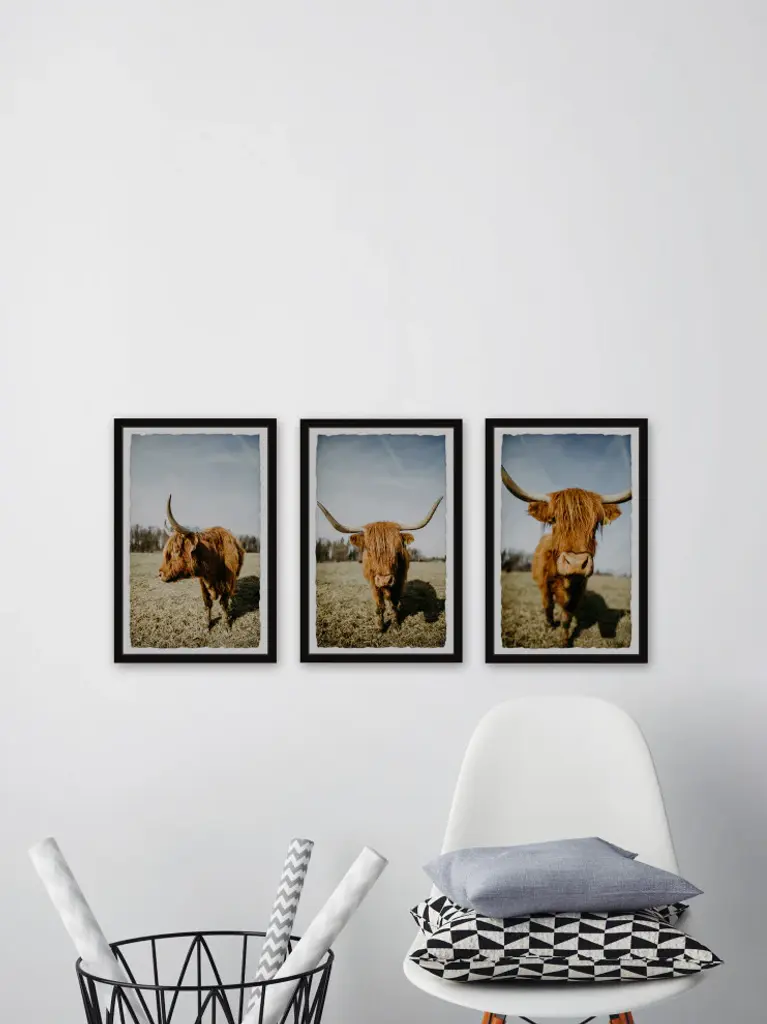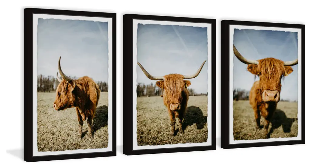 Bring a western feeling to your space with these three photographic prints that feature an ox in a sunny, grassy field. Proudly printed in the USA, this piece is printed on high quality archive paper and professionally hand-framed. With wall-mounting hooks included, this artful accent is ready to hang up as soon as it reaches your front door.- (3) panels of 8x12- Top quality Giclee print on high resolution Archive Paper- Hand cut deckled edges- High quality durable non-warping frame- Finished under shatter resistant plexiglass- Arrives ready to hang- Includes a certificate of authenticity- Printed in the USA