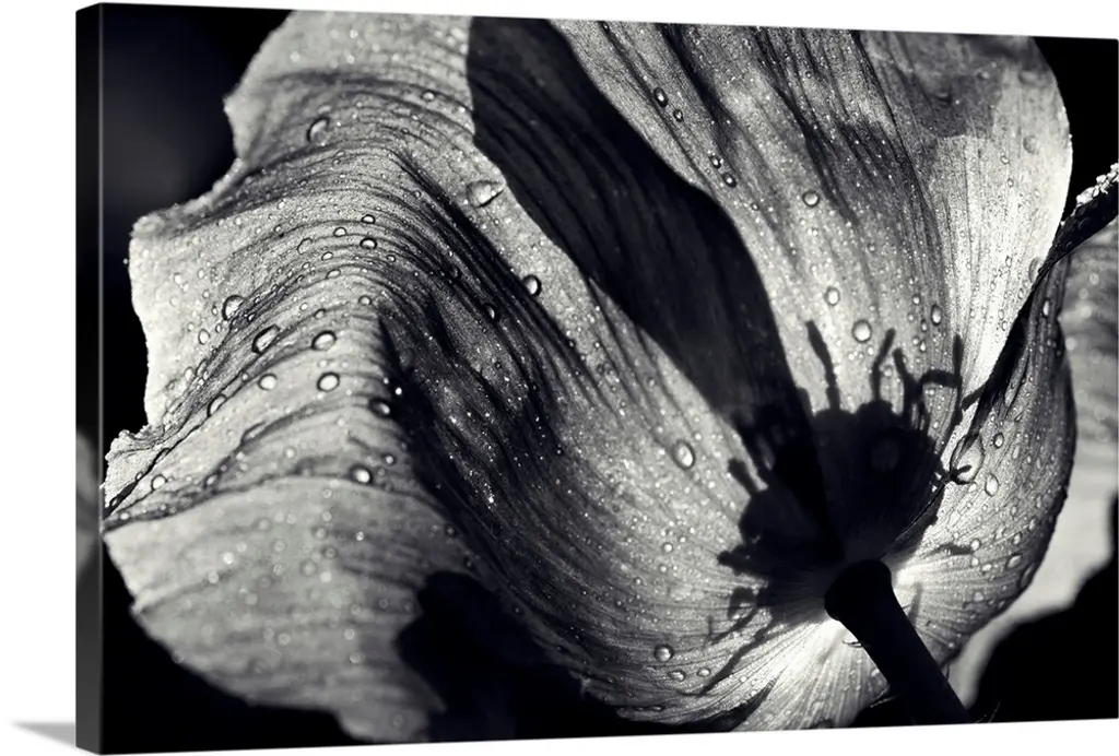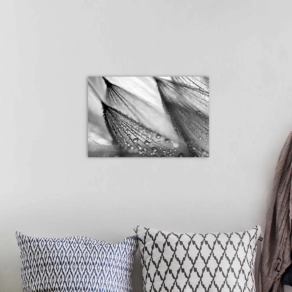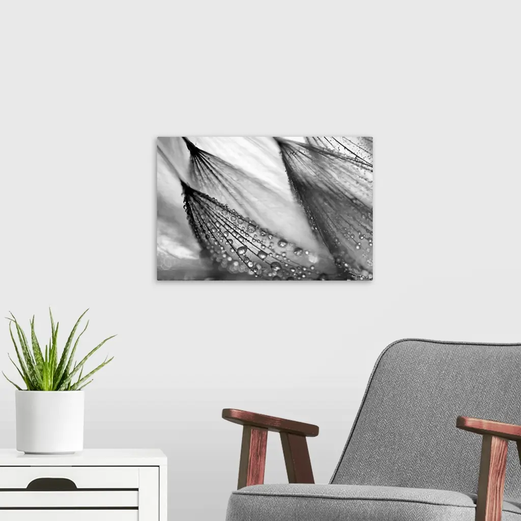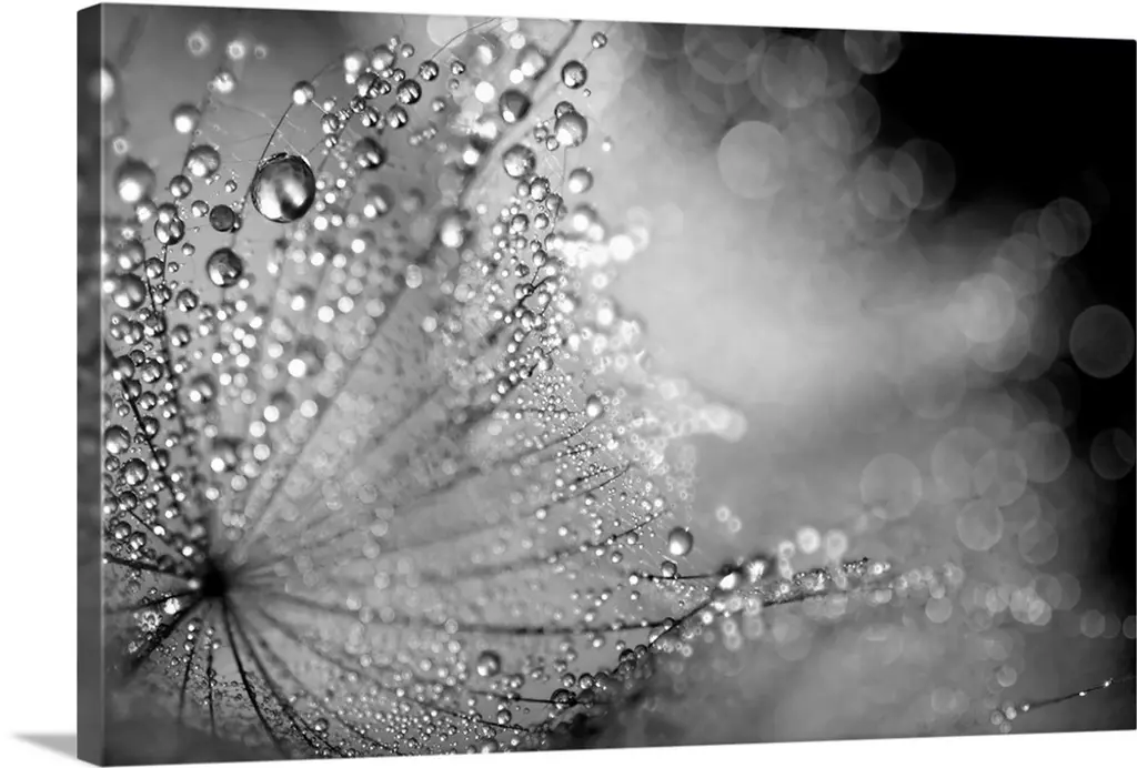 A large black and white photograph taken close up of a flower that has beads of water collected on its feather like petals.