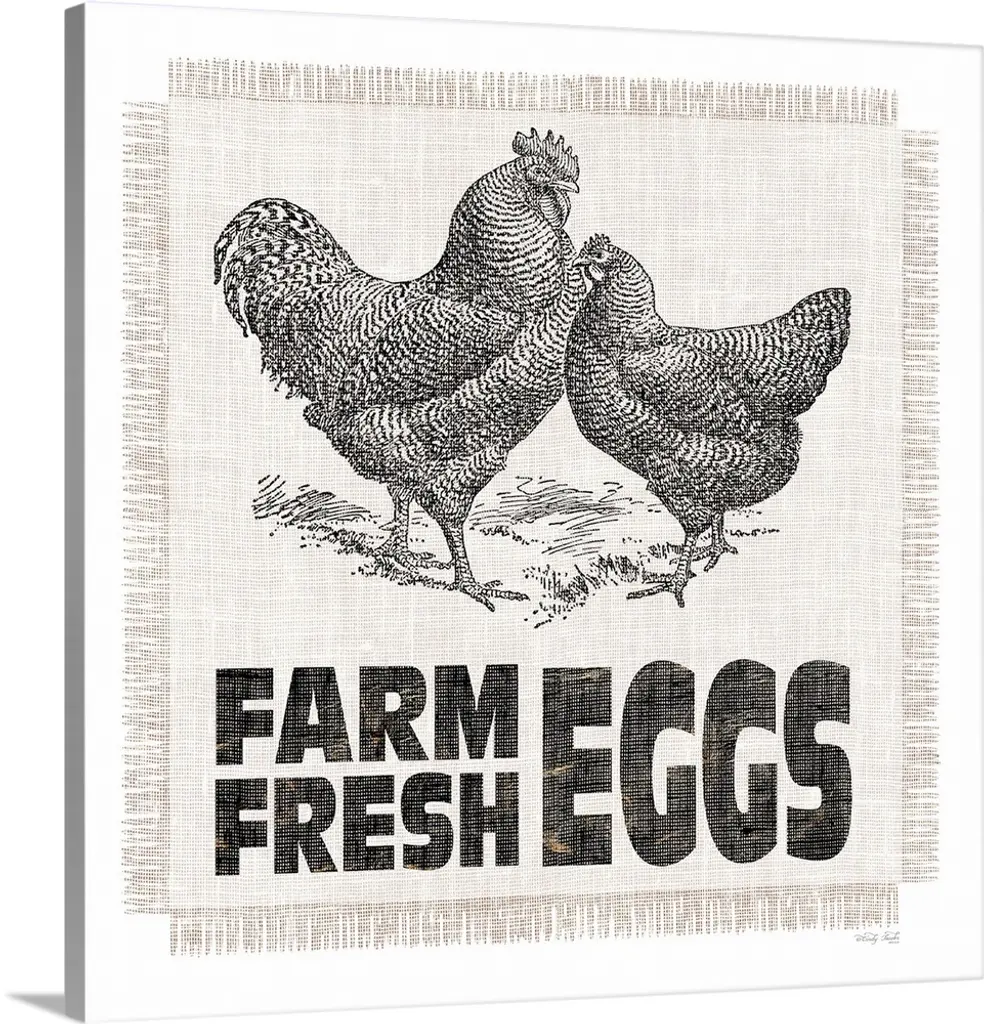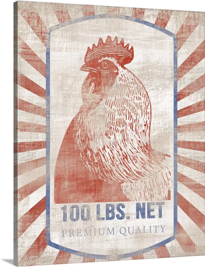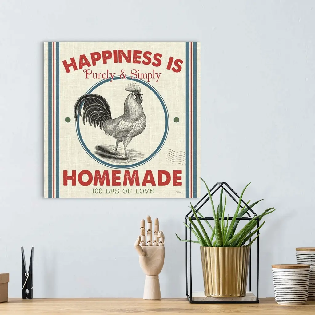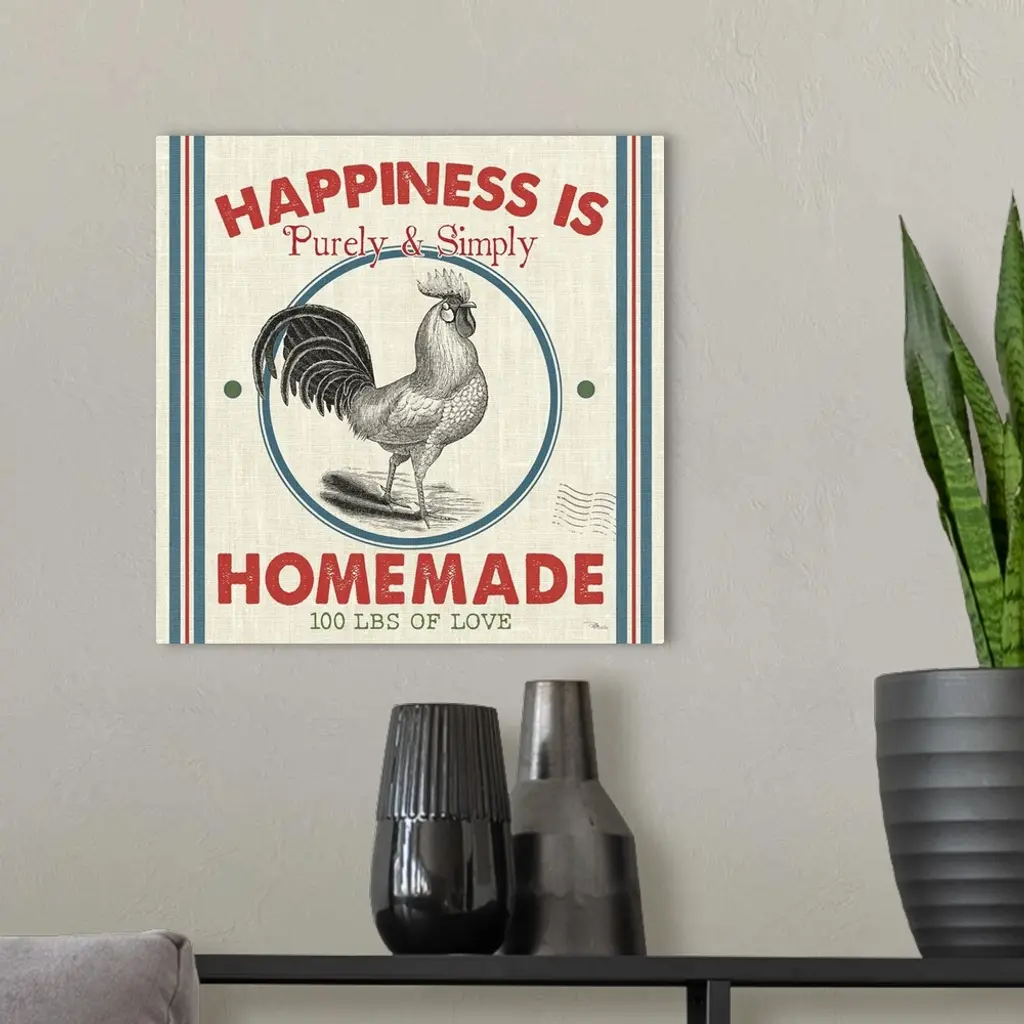 A square decorative design resembling a vintage feed sack with an illustration of a rooster and the text "Happiness Is Purely & Simply Homemade."