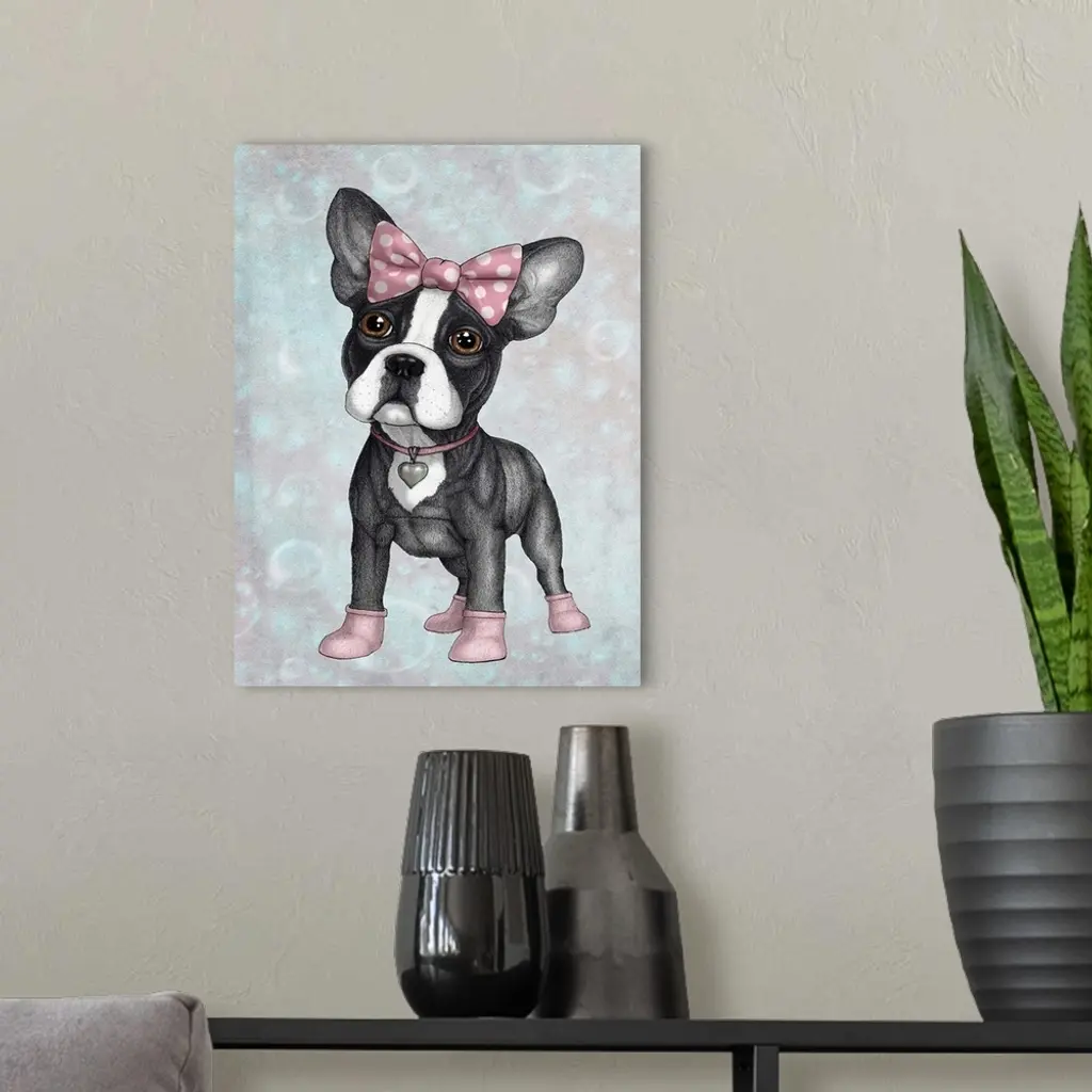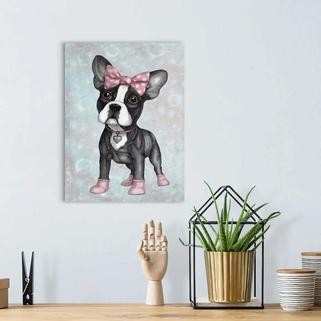 A petite french bulldog with a pink bow, collar and booties.