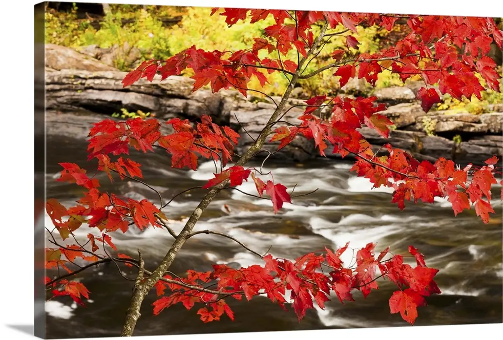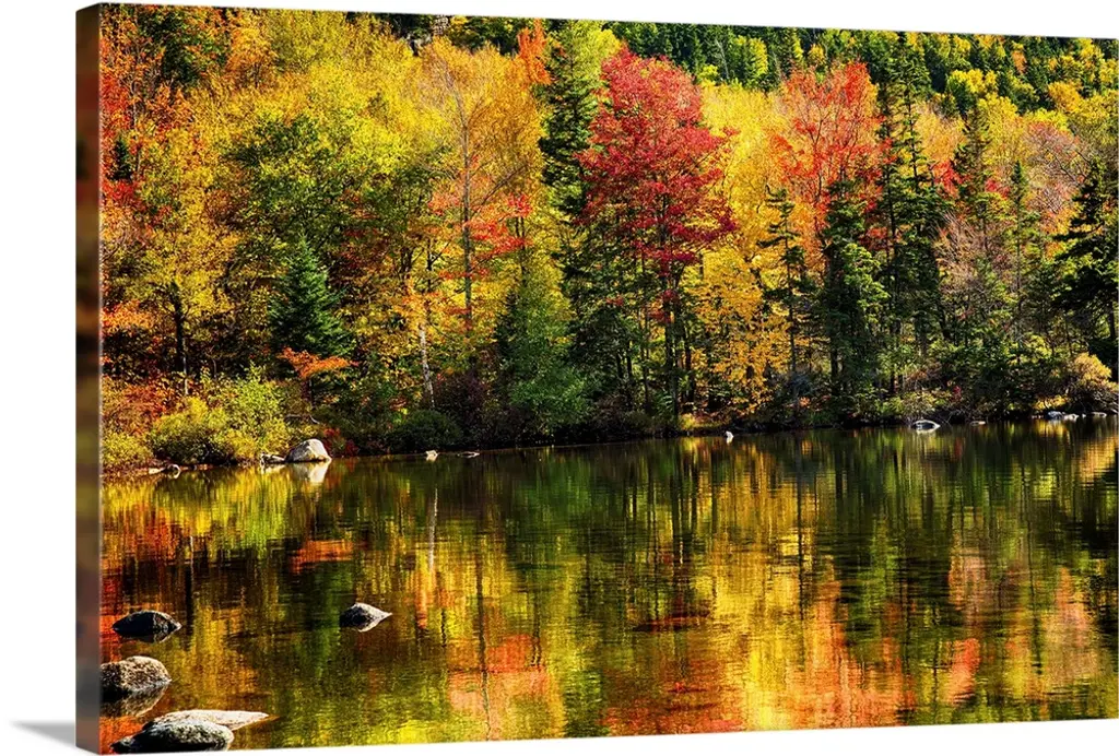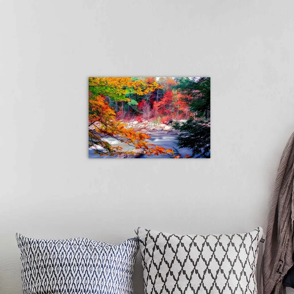 Huge photograph taken from the rocky shore of a stream running through a woodland covered in the colors of Fall.