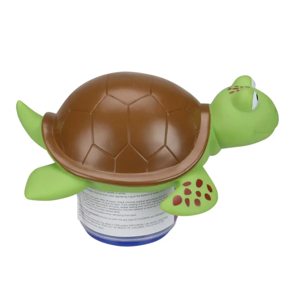 Add this decorative turtle topped swimming pool chlorine dispenser to your pool for easy cleaning. This dispenser holds up to 3" tablets and will keep your pool crystal clear and you need to do nothing at all. So let the kids enjoy pool time while this dispenser is taking care of the maintenance! Features: Turtle topped swimming pool chlorine dispenser Maintenance free way to keep the pool clean Holds up to 3" tablets Adjustable chlorinating control ring Twist off dispenser for easy refill CHLORINE IS NOT INCLUDED Dimensions:3.5"H x 7.5"W x 9.25"D Materials:plastic