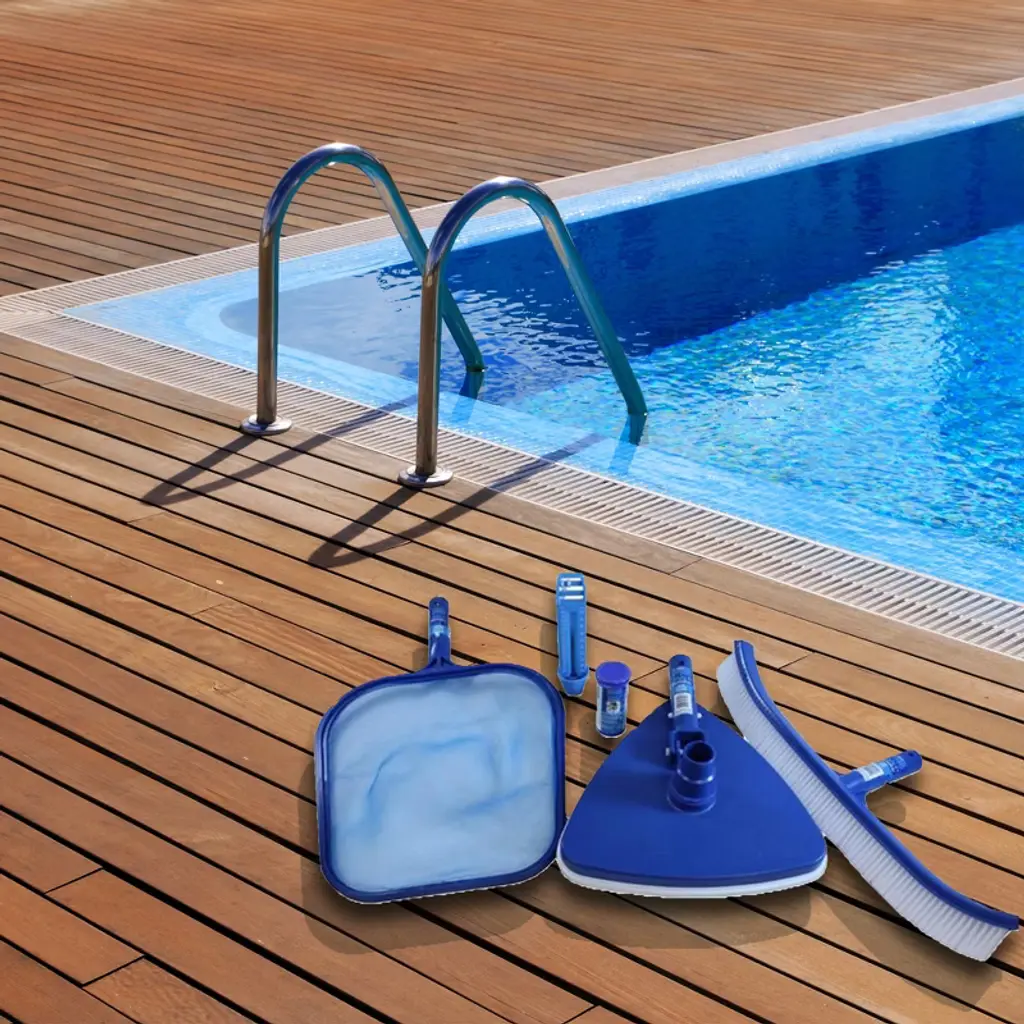 With this premium kit, maintaining your pool has never been easier. It includes everything you need for efficient cleaning and accurate water testing. The kit features a set of test strips, allowing you to monitor the chemical balance of your pool and ensure optimal water quality for a safe and refreshing swim. Say goodbye to stubborn dirt and debris with the included floor and wall cleaning brush. Its durable bristles and ergonomic design make it effortless to scrub away grime, leaving your pool surfaces spotless and inviting. The weighted vacuum adds extra power to your cleaning routine, effortlessly removing leaves, twigs, and other unwanted debris from the bottom of your pool. Keep your pool's surface sparkling clean with the skimmer head. Its wide mouth and fine mesh net make it a breeze to skim leaves, insects, and other floating debris from the water's surface. Never worry about the water temperature again with the included thermometer, ensuring you always have the perfect swim conditions. Features: Includes: floor and wall cleaning brush, weighted vacuum, skimmer head, thermometer, and test strips Cleaning brush head: Curved design Heavy duty one-piece design Easy push button on/off telepole connection 5 rows of bristles Dimensions: 18" wide Material(s): heavy-duty plastic/nylon bristles Vacuum head: Weighted triangular vacuum Easy push button on/off telepole connection Fits both 1.25" and 1.5" vacuum hoses with swivel connection Dimensions: 10" high x 10" wide Material(s): plastic/nylon bristles Skimmer head: Molded frame Lightweight Dimensions: Nylon mesh: 11.5" high x 10.5" wide (nylon mesh) Overall dimensions: 18" high x 12" wide Material(s): nylon mesh/plastic Thermometer: Measures both Fahrenheit and Celsius Comes ready-to-hang on a white cord Dimensions: 6.5" high x 1.25" wide Material(s): plastic Test strips: Canister of 50 pool or spa test strips Tests free chlorine, alkalinity and PH Note:Poles and hoses are not included