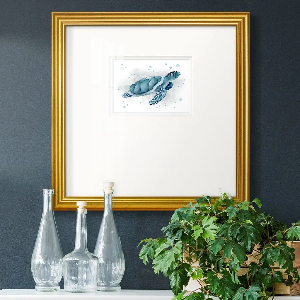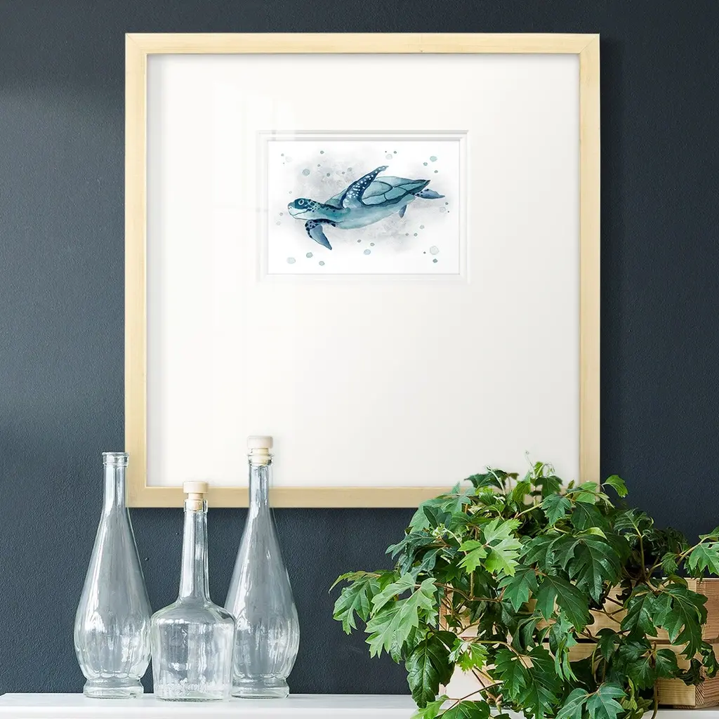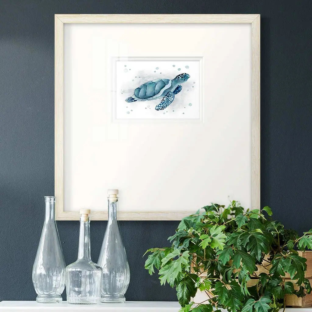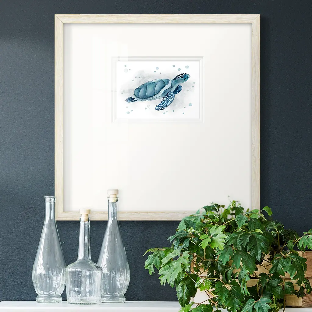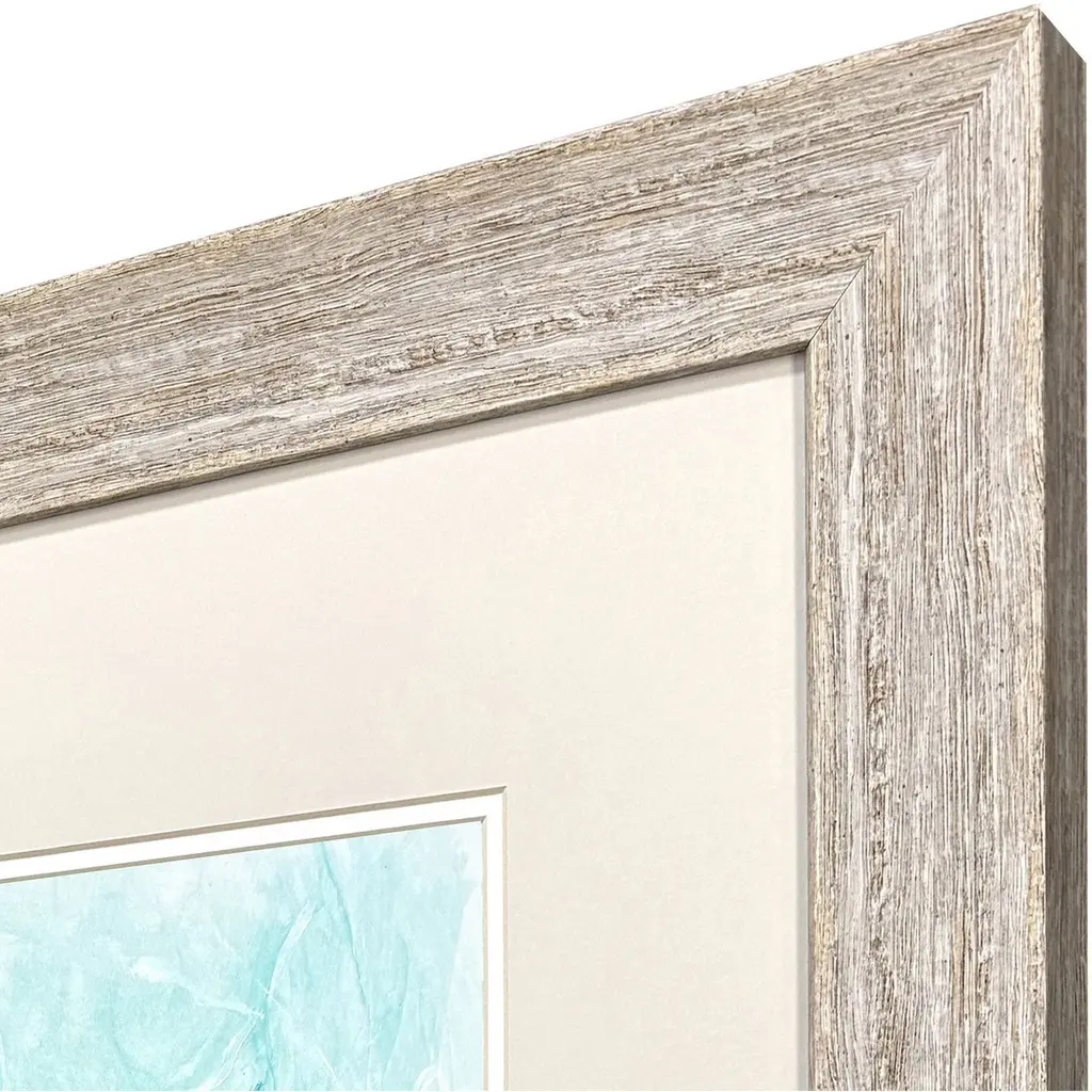 From tiny shells spring a new generation ready to bravely explore the shallows and deep sea. Matted in buff and framed in a whitewash finish molding.