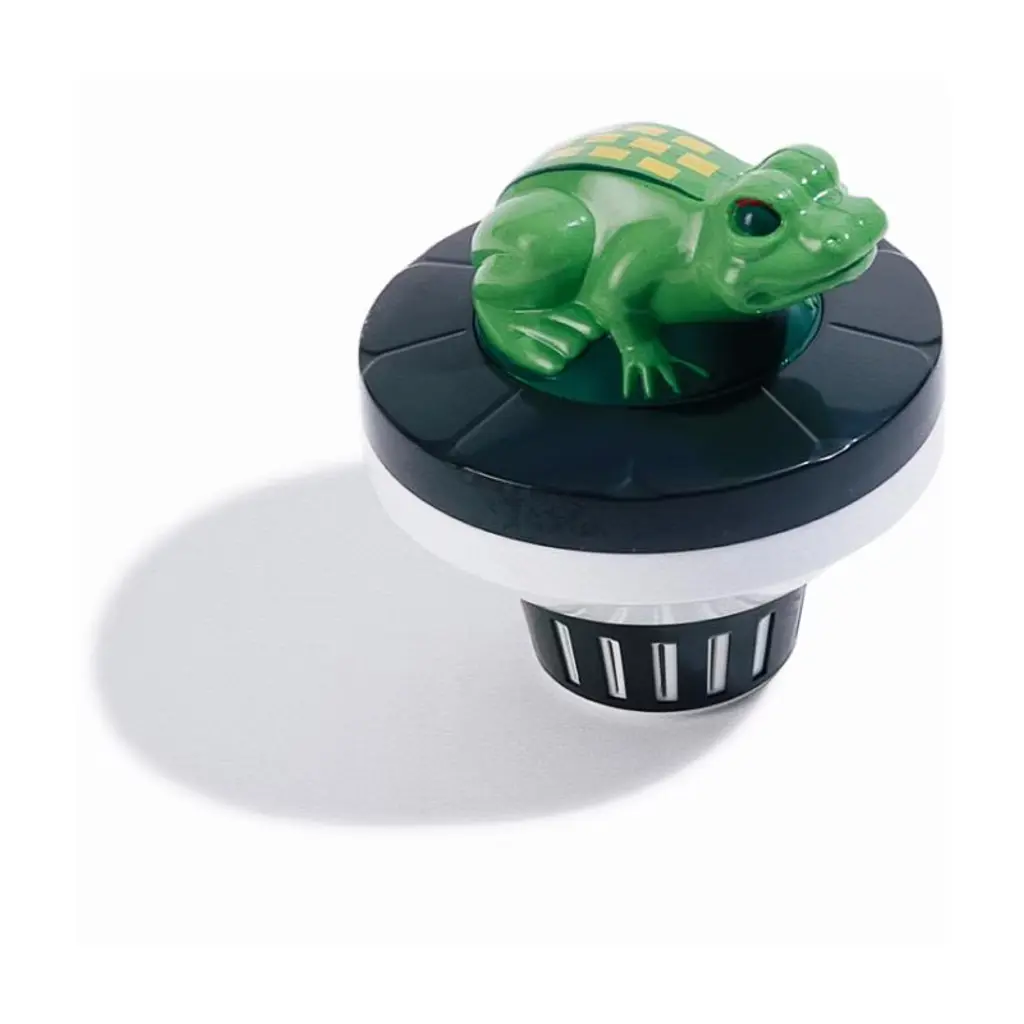 Add some fun to keeping your pool at the proper chlorine levels with this adorable green and white frog dispenser. This dispenser has an adjustable chlorinating control ring so you are adding just the right amount of chlorine to your pool. This unique chlorine dispenser will provide you a shockingly clean pool. Features: Chlorine pool dispenser The dispenser is a green frog head Non-corrosive ABS body Adjustable chlorinating-control ring Balanced buoyancy Twist-lock cap Holds up to 3" tablets or sticks Suitable for all types of pools CHLORINE IS NOT INCLUDED Dimensions: 7.5" high x 7.5" diameter Material(s): heavy duty plastic