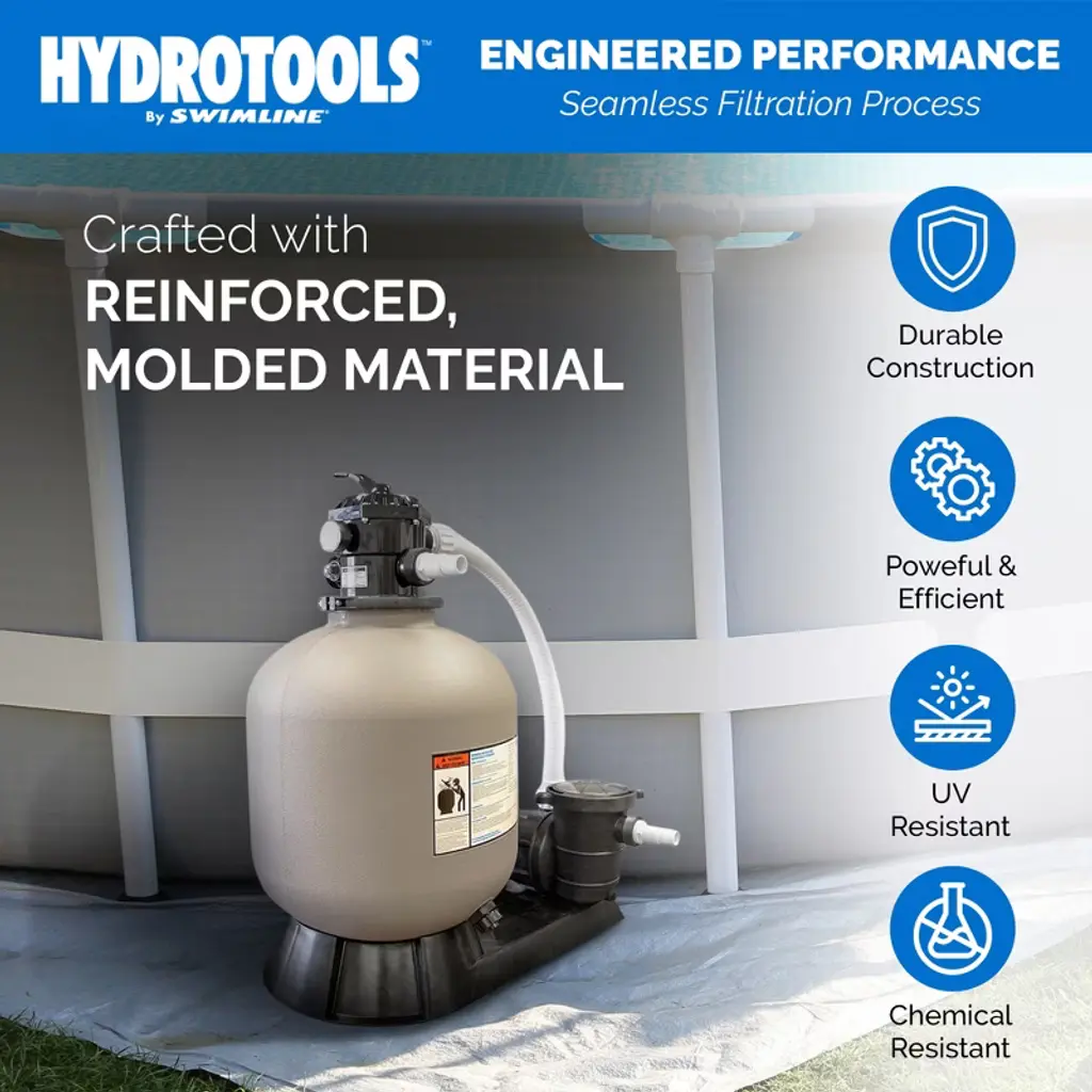 Hydrotools by Swimline's extensive Sand Filter collection sets the standard for performance at affordable prices. Hydrotools sand filters are meticulously designed to efficiently and consistently filter your pool while optimally conserving energy and complying to new DOE compliance and regulations. This ultimately leaves Hydrotools customers with filters perfectly constructed to promote the cleanest water quality, while providing a quick, simple user experience. Our tanks are carefully molded and double reinforced to ensure a reliable, air tight compartment for filtration action. Sand can withstand approximately 5 years of use before replacement depending on water chemistry and proper backwashing frequency. Sand is not included with our filter systems. The pumps housed by our sand filter combo systems have been upgraded to run on low noise levels, creating a fantastic user experience for our customers. Hydrotools pumps also now far exceed current performance and efficiency regulations. All Hydrotools Sand Filter Combo Systems come with everything you need out of the box. Components include: Tank, Pump, Filter Base, Multi-Port Valve, 3-Prong Plug & Power Chord, and more. Spend less time worrying about maintaining your pool, and more time enjoying it - the Hydrotools goal is to help you achieve more quality time on the water with friends and family.