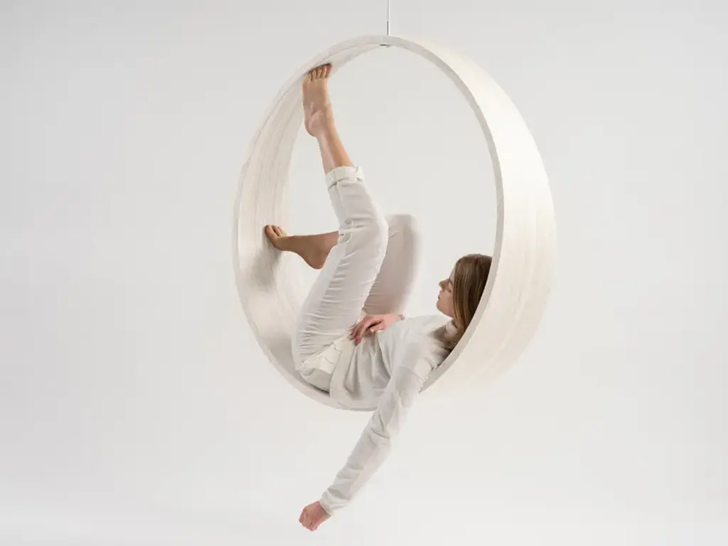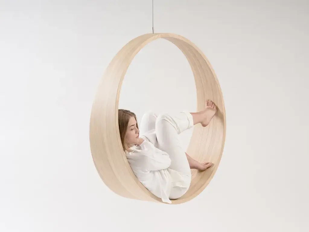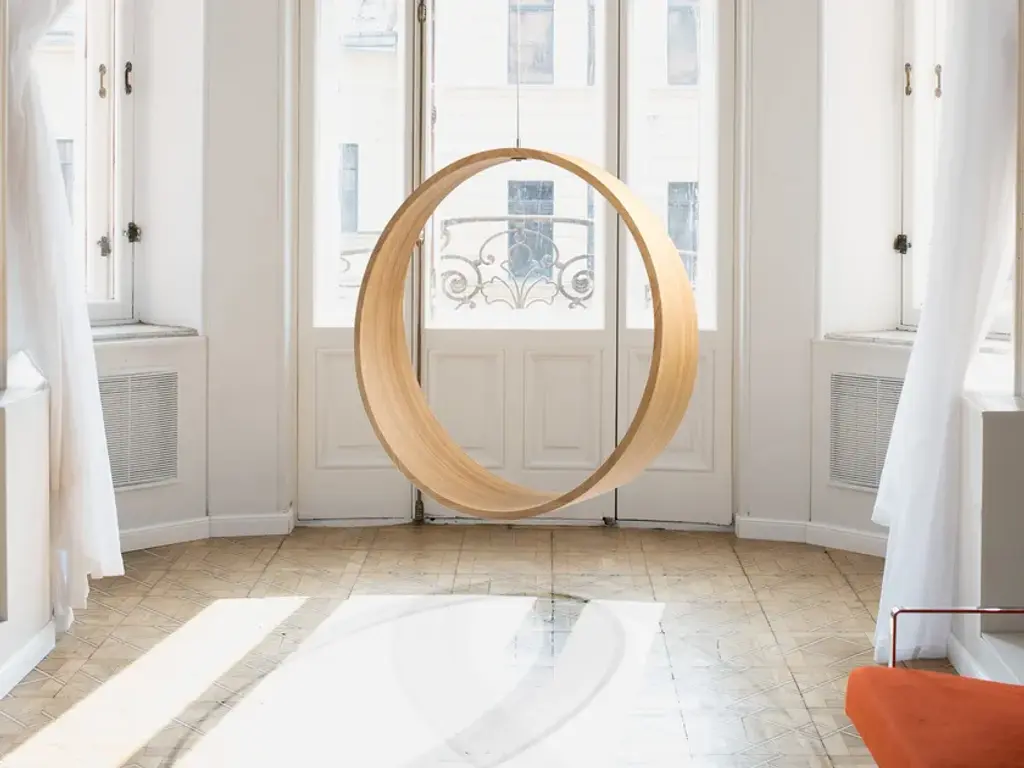 You may think it sounds a little childish or a little dangerous to have a swing inside, but it can actually be a stylish and even romantic way to add some extra seating or just some extra character to your place.We promise it’ll be your favourite feature in the house. Seriously, who wouldn’t want to play on one of these chic swings.An indoor swing is surprisingly versatile and can look sleek and industrial, or can go full-on bohemian romance.INDOORDisplaying a simple round shape, this charming swing chair easily adapts to a variety of contemporary decors.The unconventional piece appeals to children and adults alike, making it a lovely catalyst for socializing.The swing it is unsuitable to outdoor. It is not hot sunlight and rain resistant. Indoor version, in standard colours, waxoil finish: natural oak, little white, white and black.OUTDOORA simple round shape for patio, balcony and garden. The idea of leg-supported seating units does not appeal much to Polish designer Iwona Kosicka, who recently created SWING, her version of a comfortable chair. Varnish finish in standard colours: natural oak, little white, white and black.6m rope - For special order any length of rope is possible.