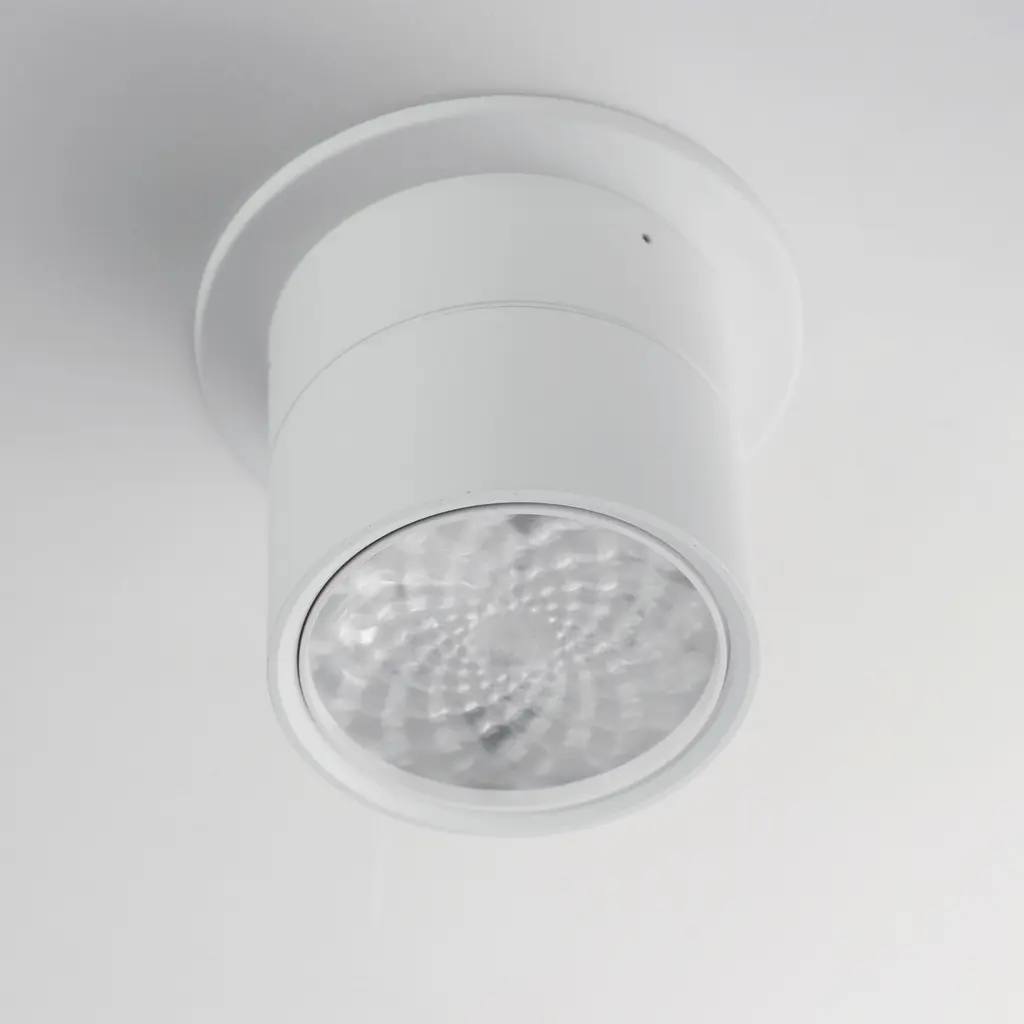Inconspicuously recessed within its cylindrical house, an extending arm transforms this surface mounted light fixture into an adjustable spotlight. Simply unthread the top half along the seam to extend the frame length and swing the fixture into position. Twist the lens on the face of this fixture to adjust its beam angle spread. Available in Black and White and two apertures that include a mud-in ring for an even cleaner installation.