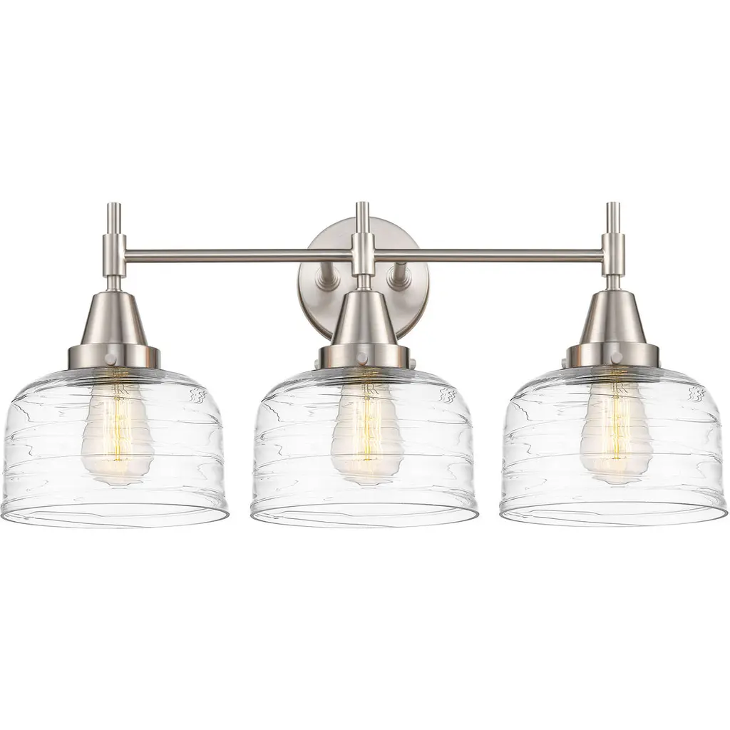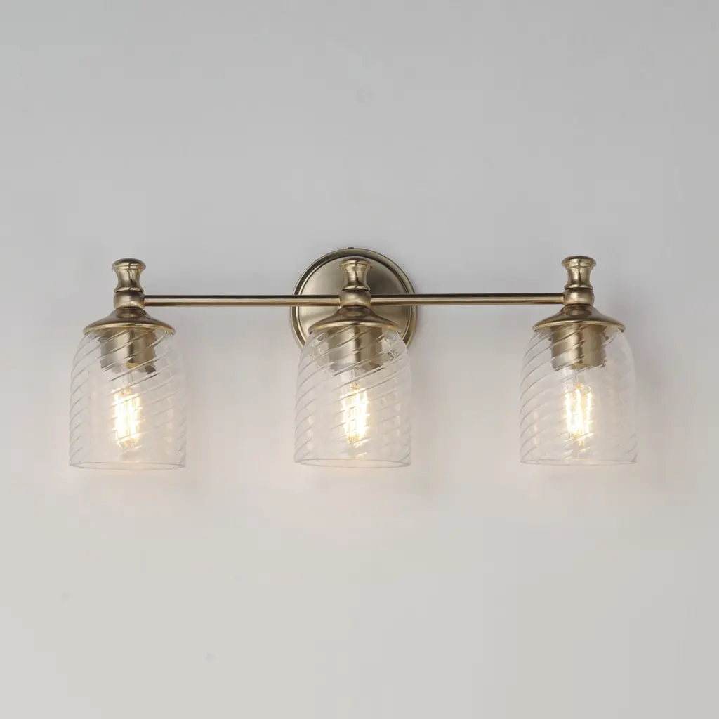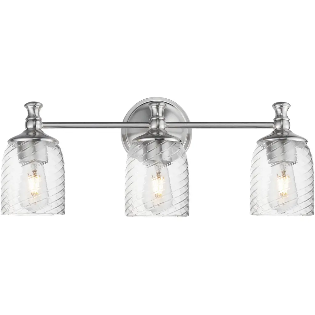 Traditional bell glass shades are reimagined with a swirling and fluted pattern. These Clear Ribbed glass shades are combined with traditional elements on the frame that complete the design. Available in Polished Nickel, Antique Bronze, or Satin Champagne finishes.