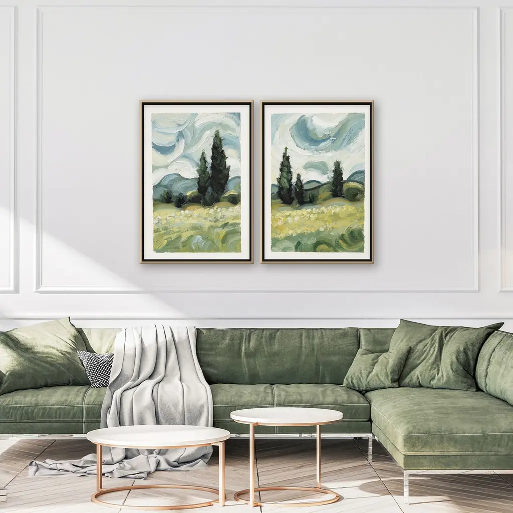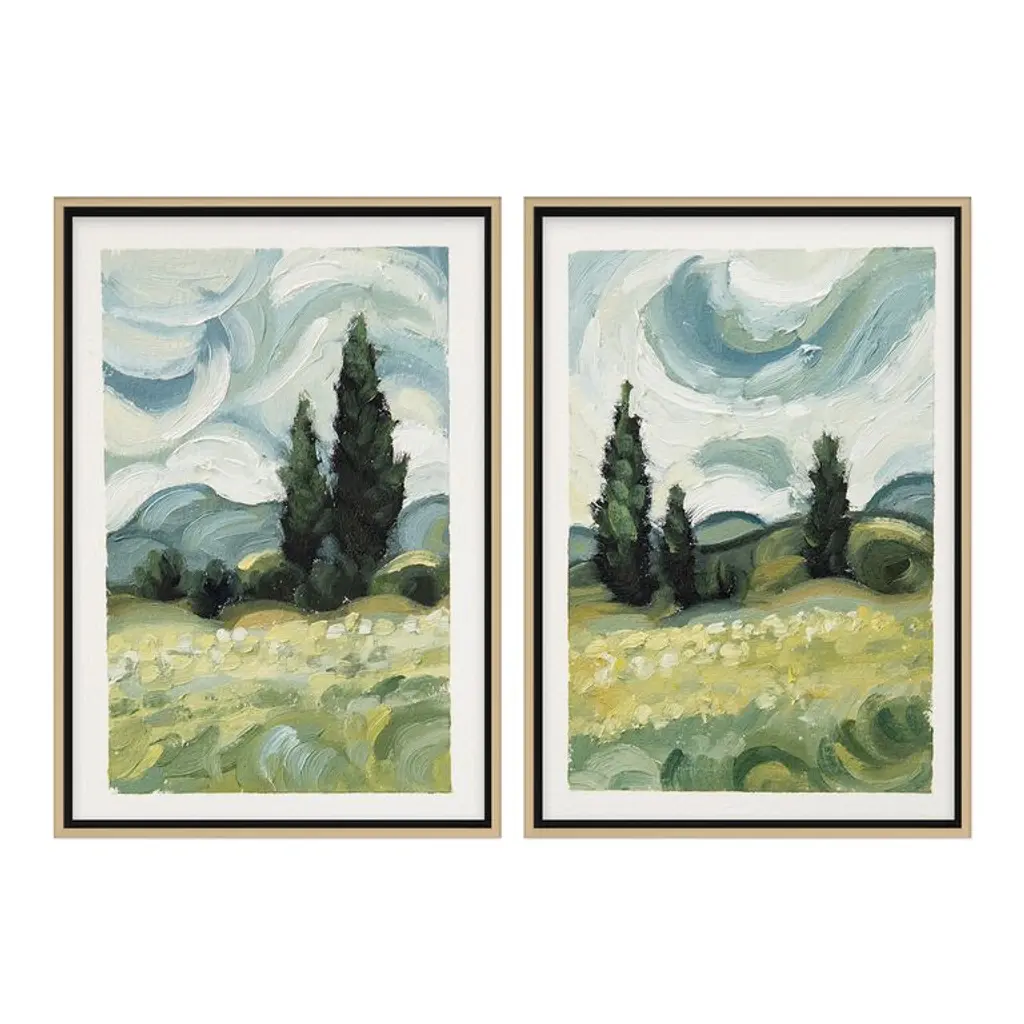 An entrepreneur and skilled painter, Marian Parsons creates a captivating landscape scene on our framed canvas wall art set. With a swirling sky, mountains and trees in a calming palette of blue, green and white, this diptych wall decor makes a timeless statement in any bedroom or living space. The excess materials created in the handcrafting of this artwork are reused and recycled as art supplies for a Tennessee nonprofit called Minor Masters.