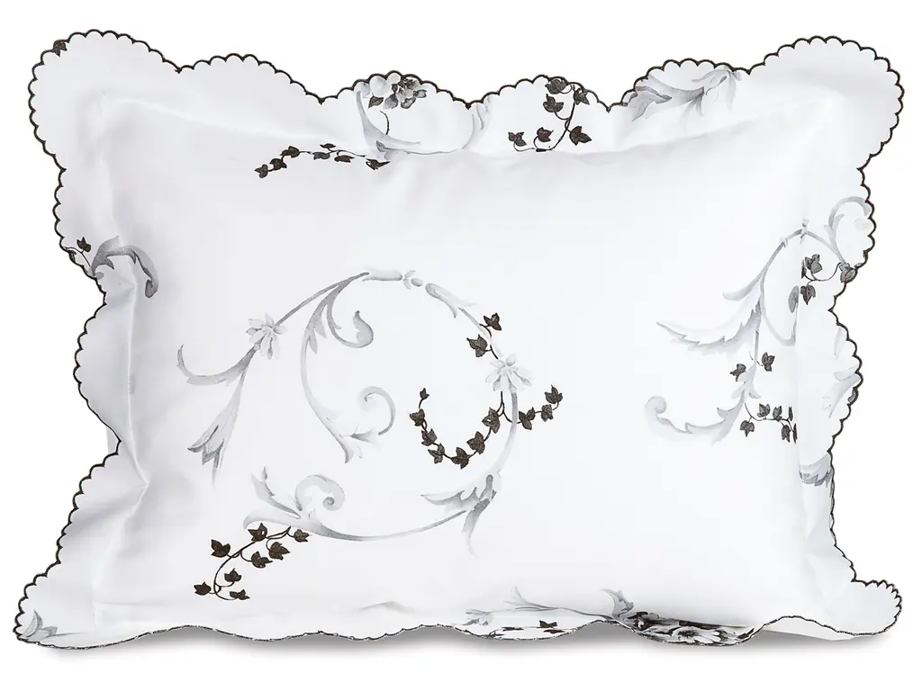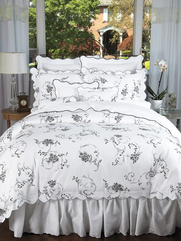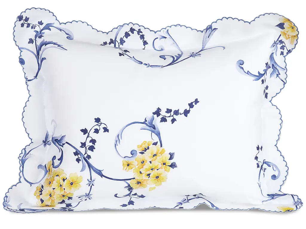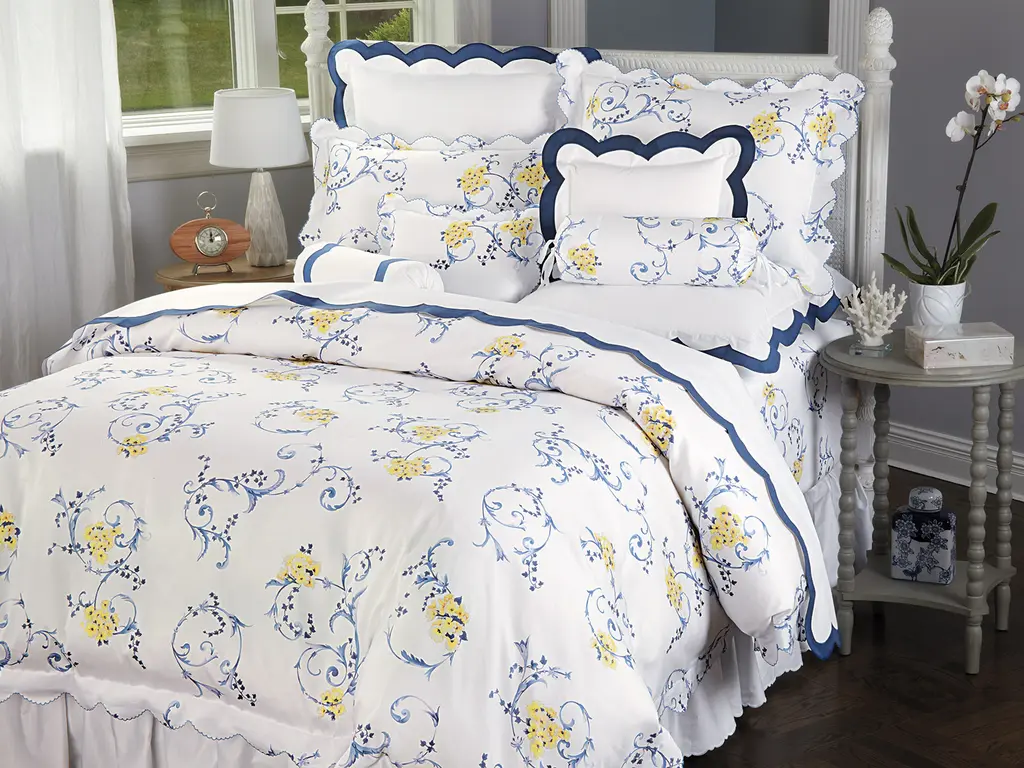 Don’t be surprised when you experience unexpected moments of happiness while admiring the captivating beauty of this room-awakening print. Floral swirls twist and spiral across Italian 300 thread count Egyptian cotton sateen to commemorate the uninhibited flow and harmonious joy of the natural world. Tiny scalloped edges border the design with lush, cozy curves. Made in Italy in your choice of Yellow, Blue and White or Gray and White combinations.