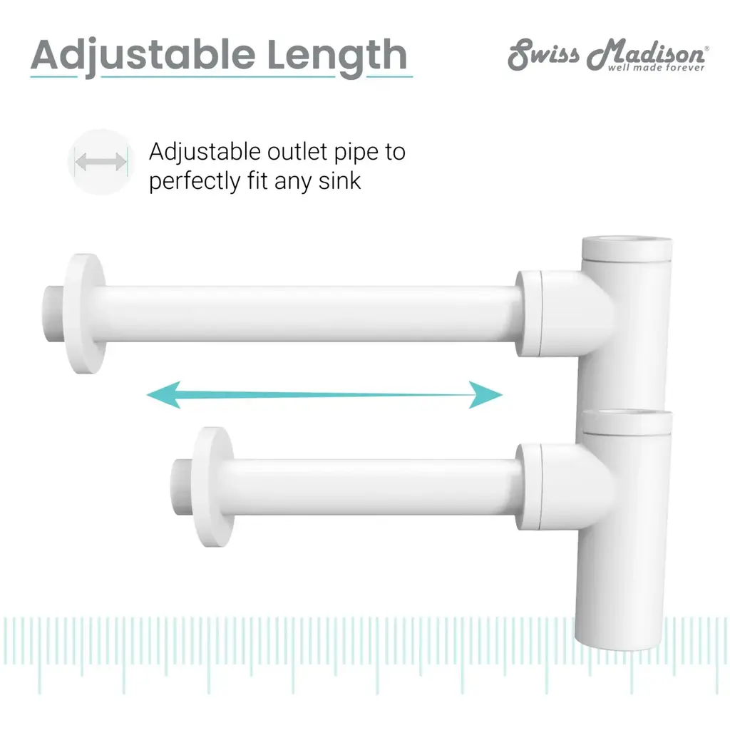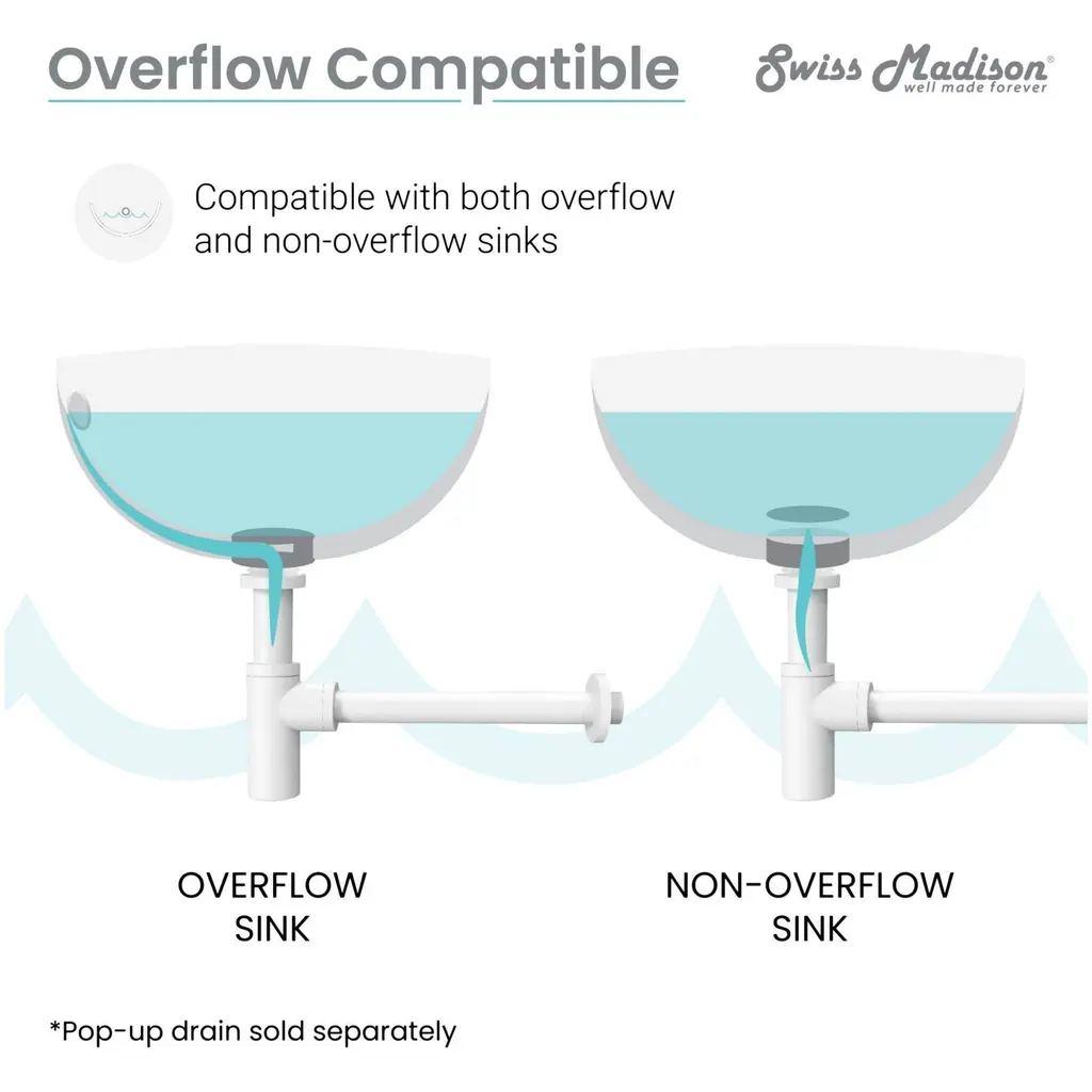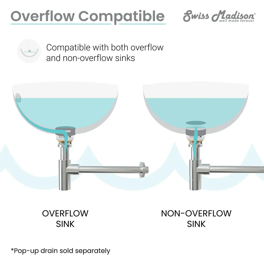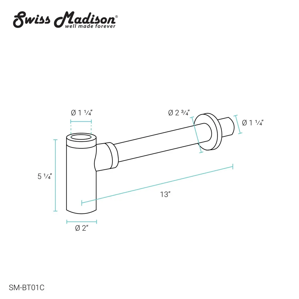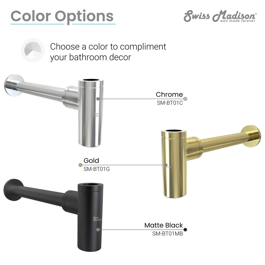 The Swiss Madison Bottle Trap Drain provides an alternative to the traditional P-trap option, providing a more decorative solution to any bathroom with exposed plumbing. The smooth interior ensures there won’t be any unwanted odors or build-up. Available in multiple color variations, the bottle trap drain provides adaptability for any size needed.Swiss Madison SM-BT01 Features:Swiss Madison SM-BT01 Specifications: