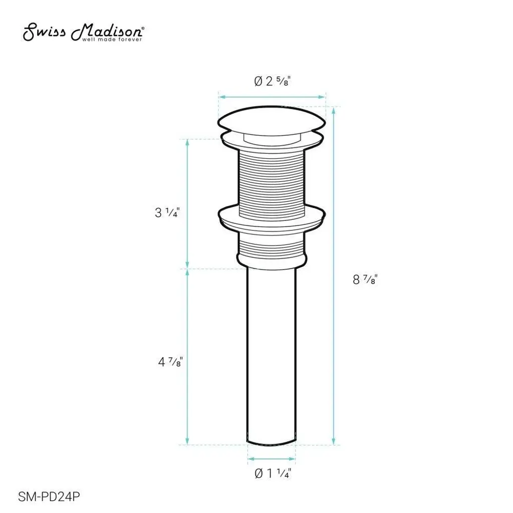 A modern and sleek drain for Swiss Madison brand sinks. Our pop-up drain adds sophistication and convenient operation to any bathroom sink. Simply pressing the drain allows it to open and close.Swiss Madison SM-PD24 Features:Swiss Madison SM-PD24 Specifications:
