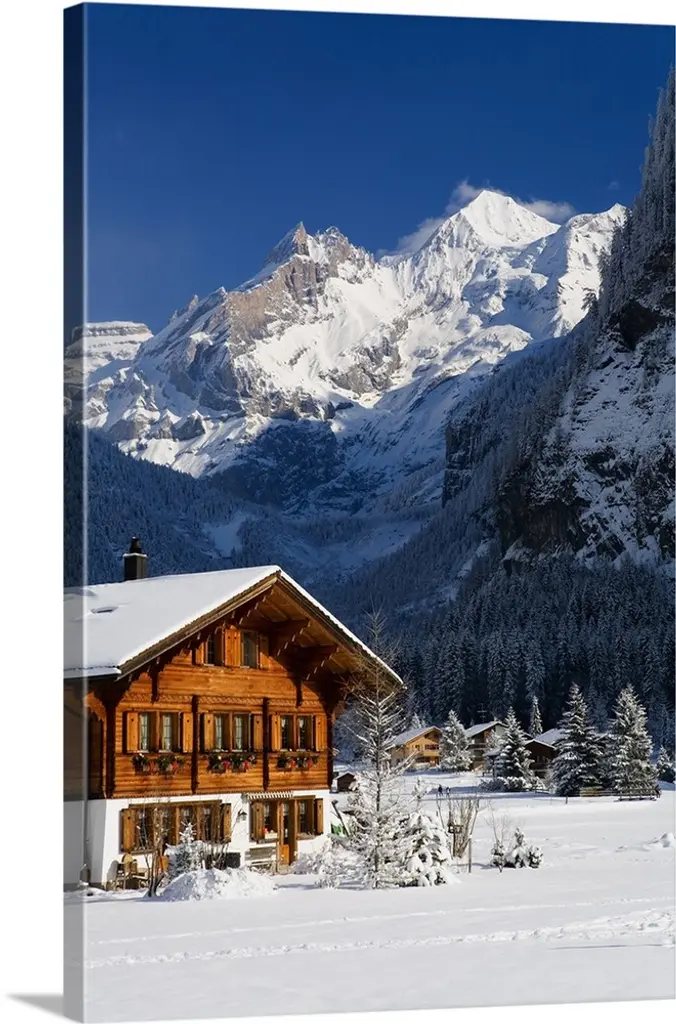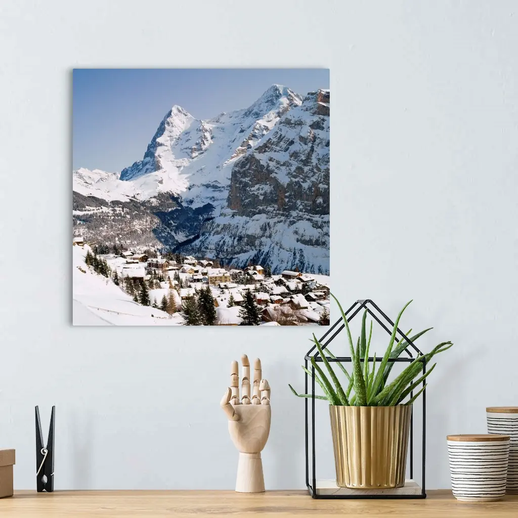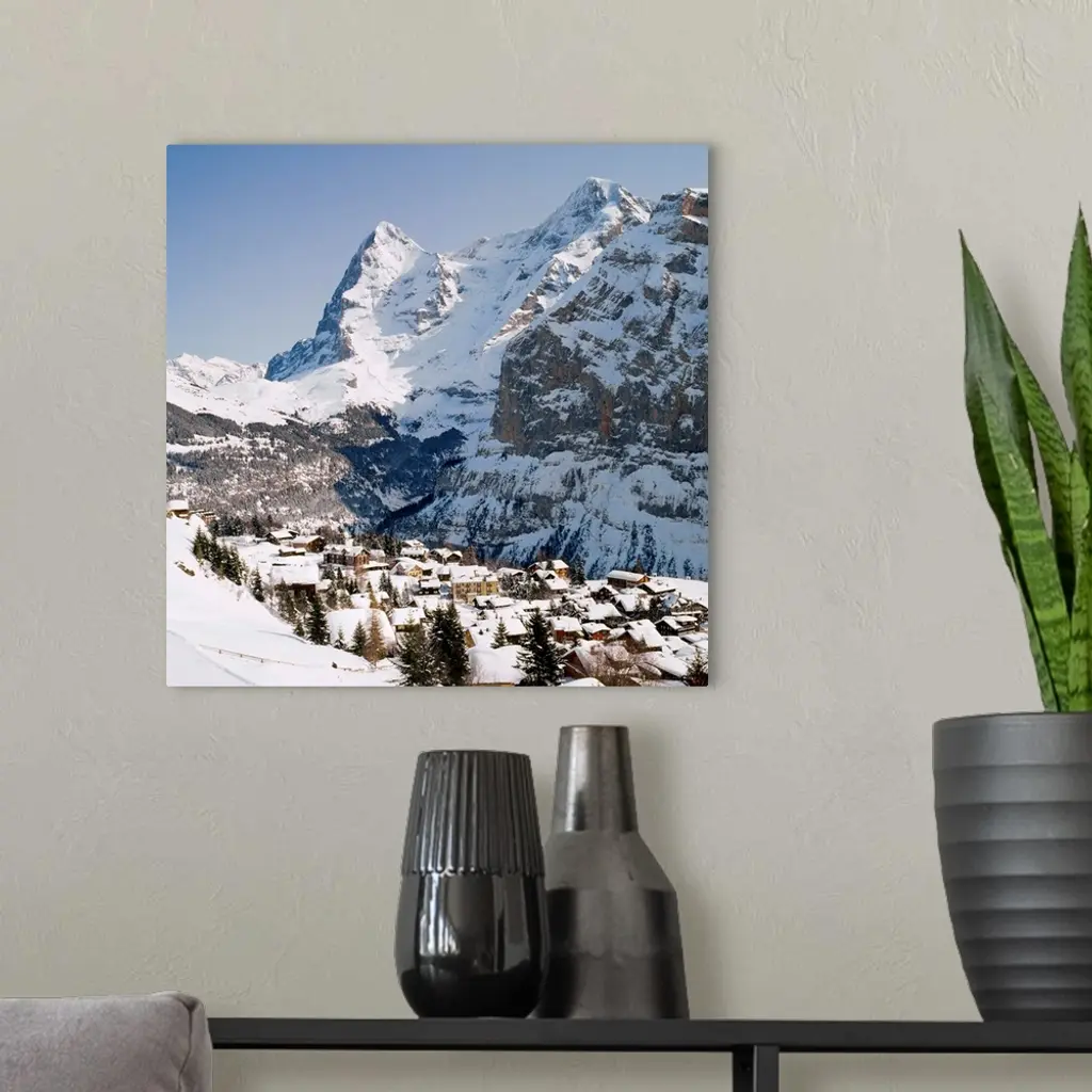 Switzerland, Bern, Murren village, view towards Eiger and Monch mountains wall art for home and office decor. Discover canvas art prints, photos, mural, big canvas art and framed wall art in GreatBigCanvas.com's varied collections.