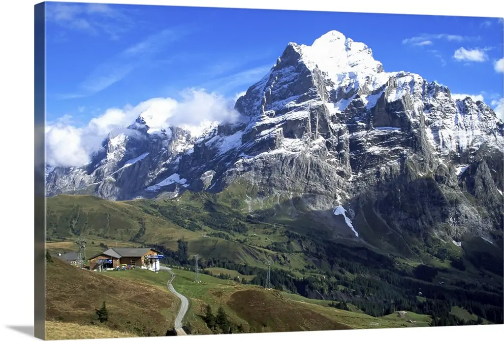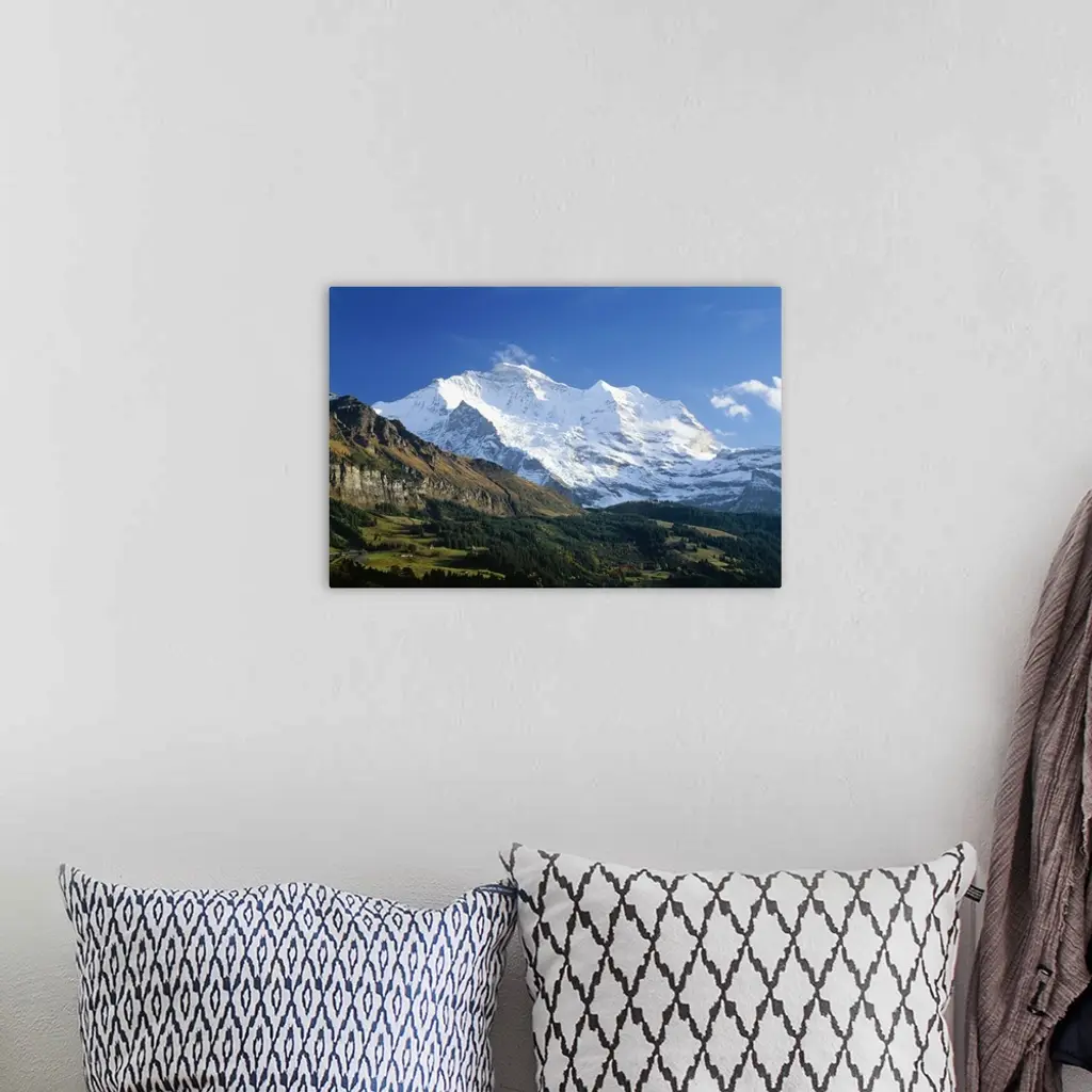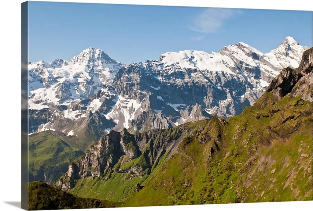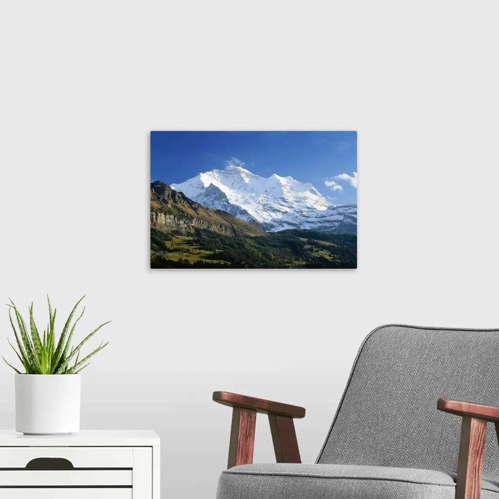 Switzerland, Bern, View towards Wengen village, Eiger, Monch and Jungfrau mountains wall art for home and office decor. Discover canvas art prints, photos, mural, big canvas art and framed wall art in GreatBigCanvas.com's varied collections.