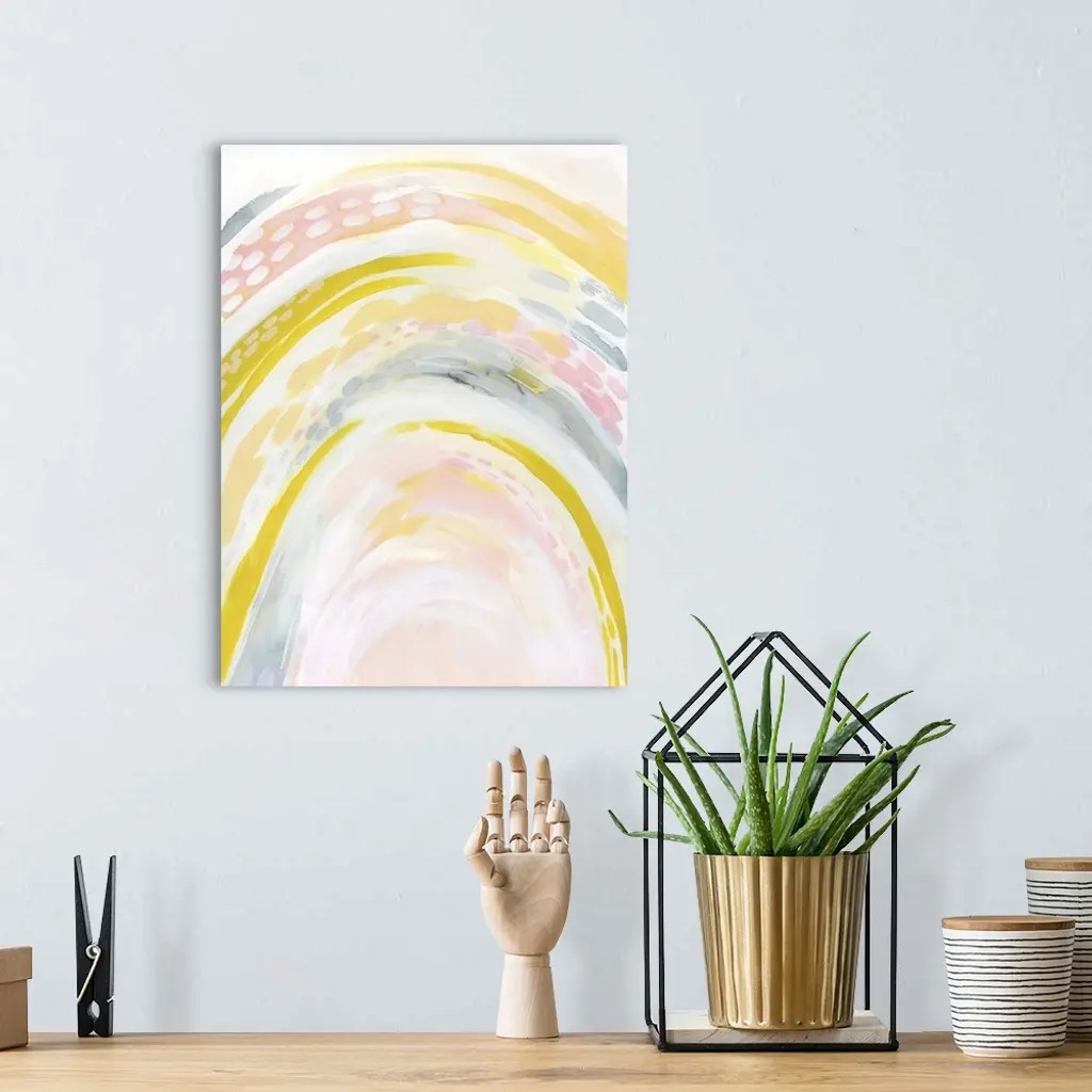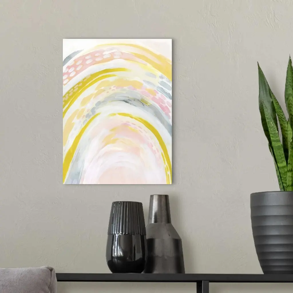 Contemporary abstract in pastel hues and bright yellow-greens.