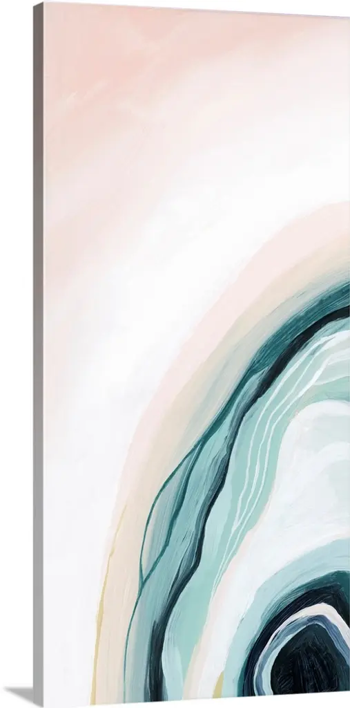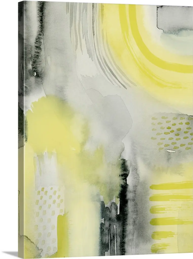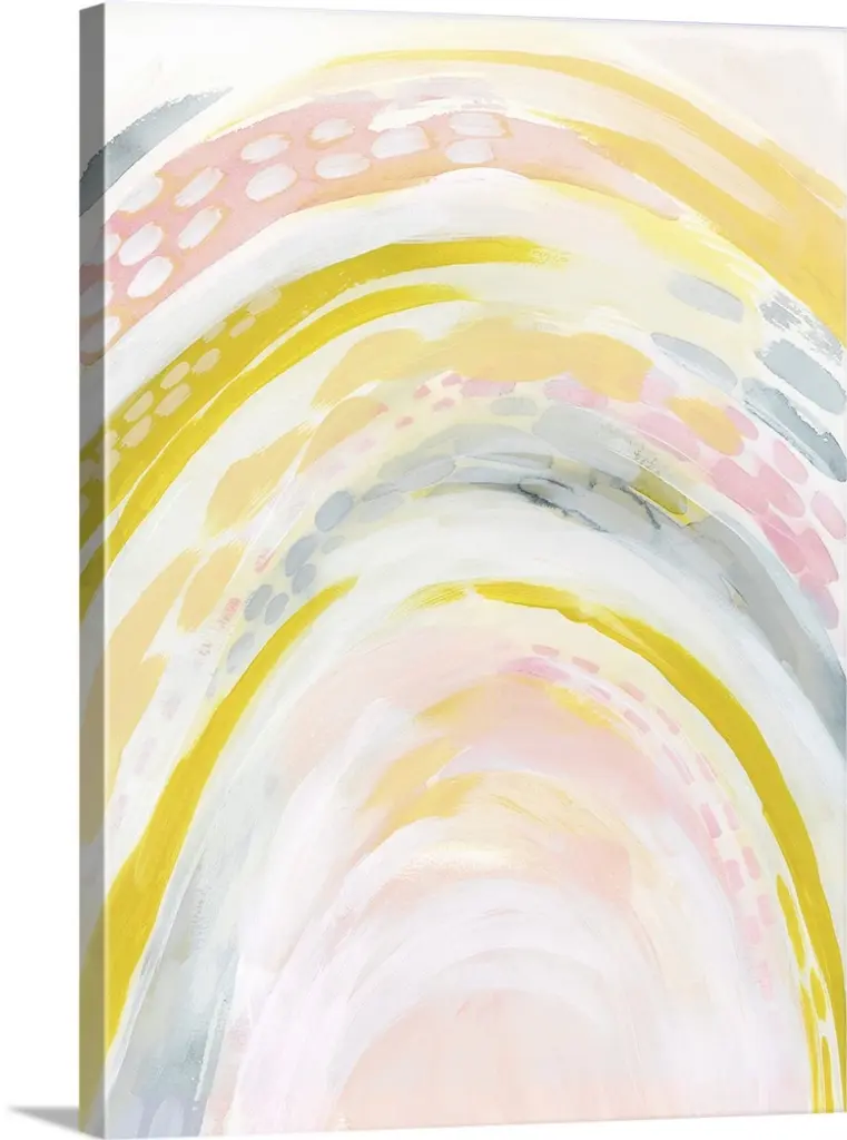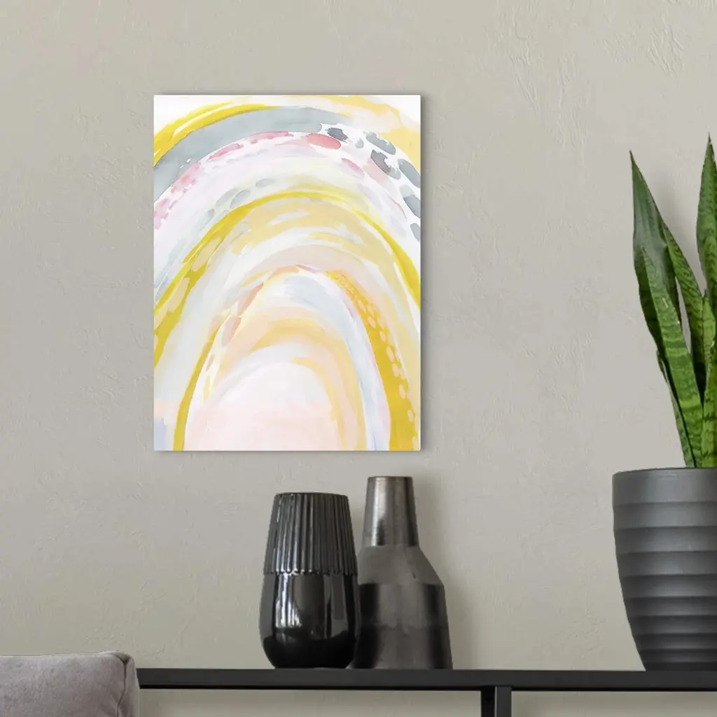 Contemporary abstract in pastel hues and bright yellow-greens.