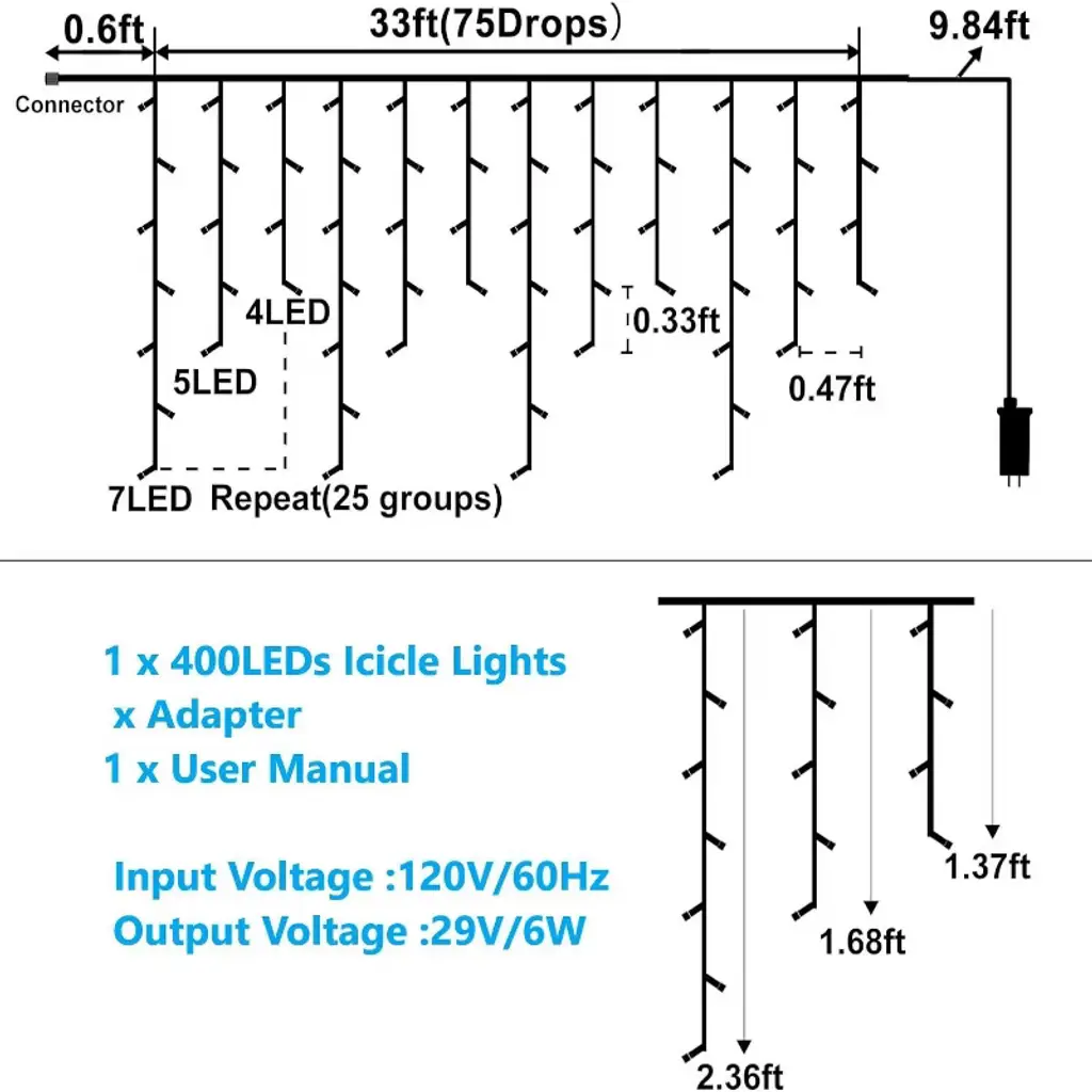 Transform your holiday decor with these vibrant 400LED icicle lights featuring a 33ft cascading design (42.8ft total length). These energy-efficient lights offer 8 dynamic lighting modes (including twinkle, fade, and wave effects) controlled via the adapter button. With IP44 waterproof rating and 29V low-voltage operation, they're safe for indoor/outdoor use in all weather. The memory function retains your last setting, while the 6-hour timer (on)/18-hour (off) cycle provides automatic operation. Connect up to 3 sets (end-to-end) to illuminate large areas, perfect for roofs, patios, or holiday displays. The cool-touch LEDs remain safe during extended use, making them ideal for Christmas, weddings, and year-round celebrations.