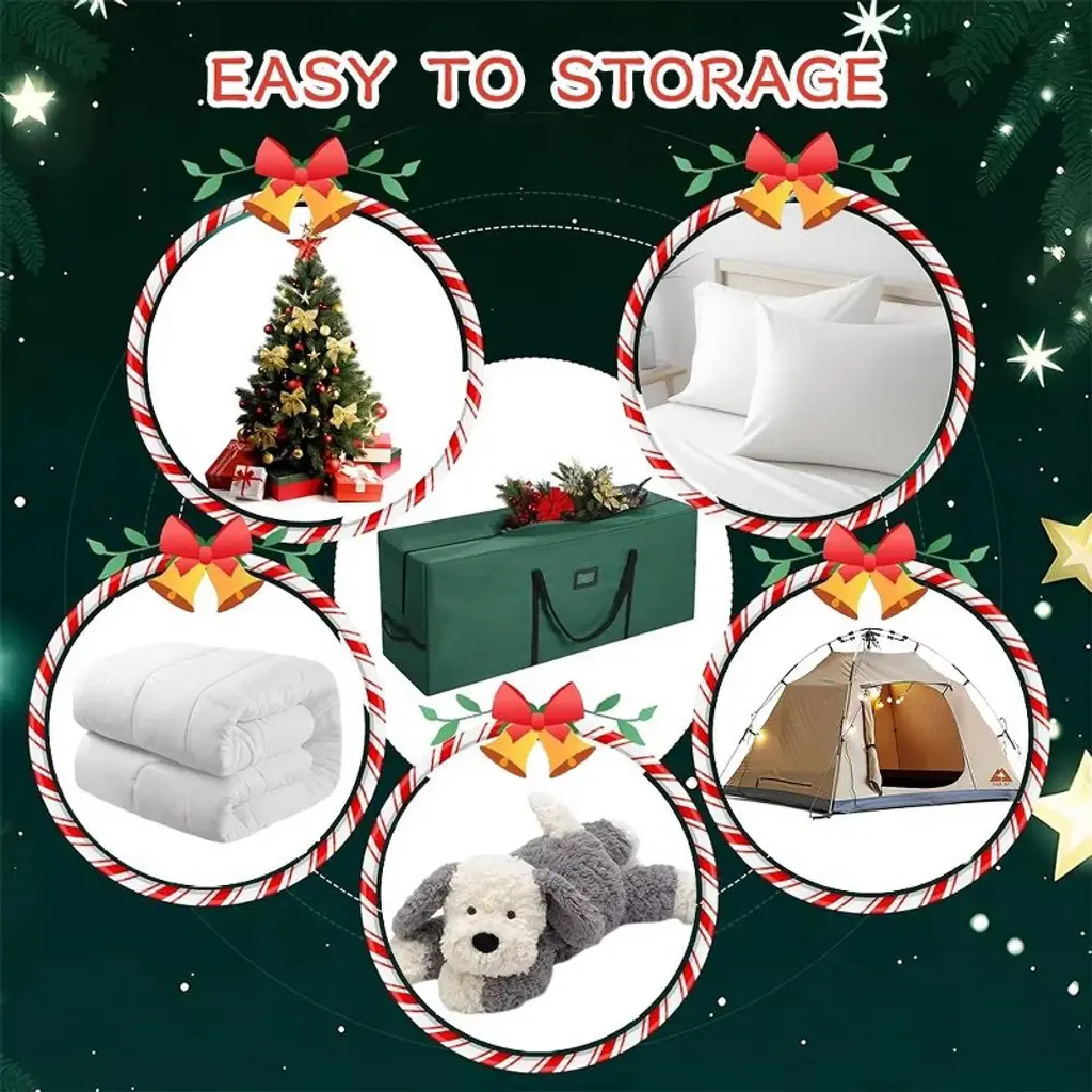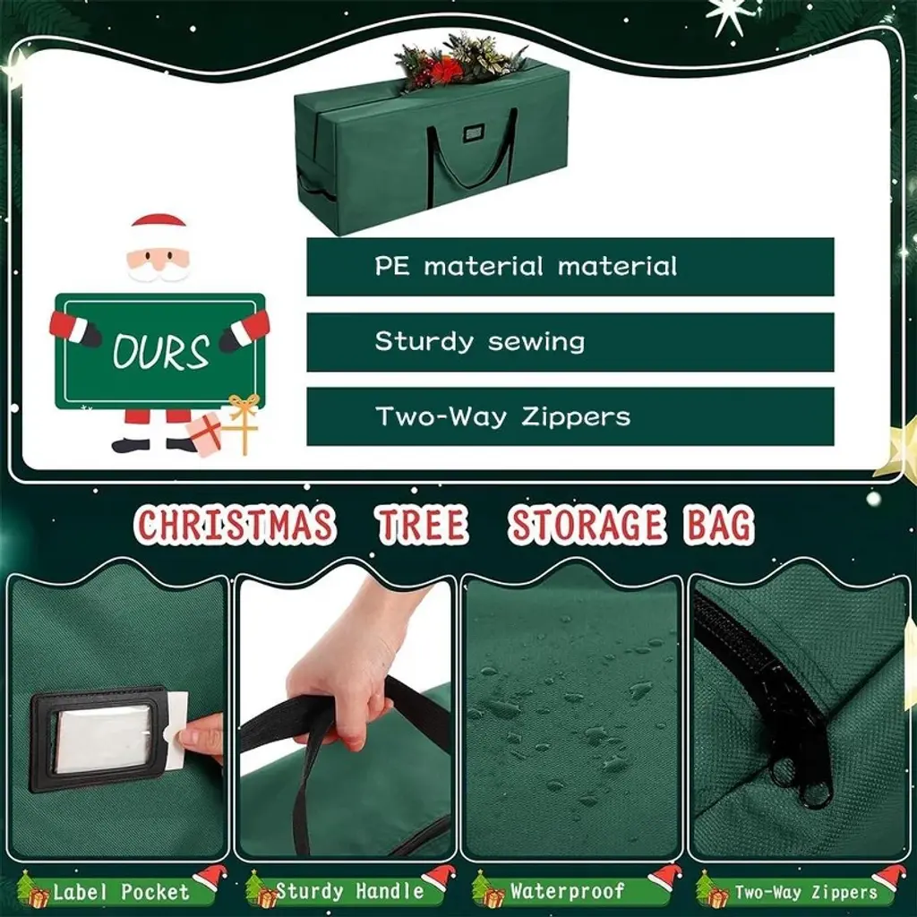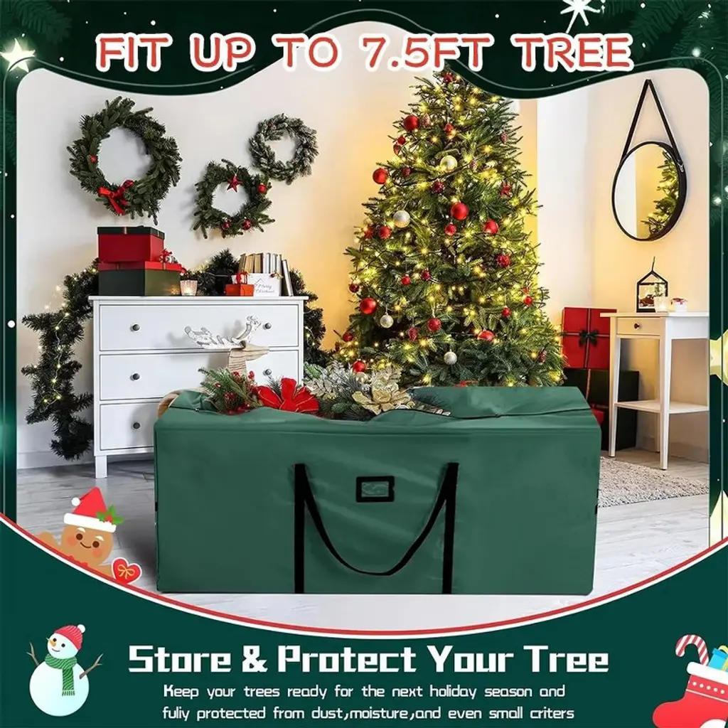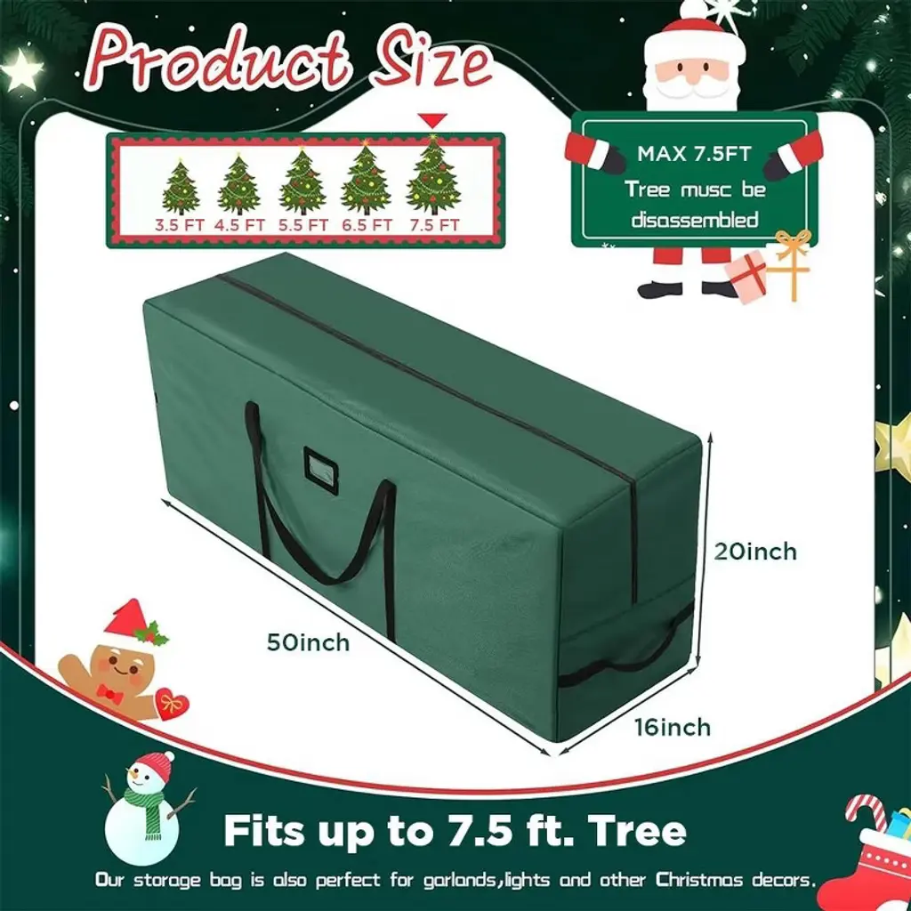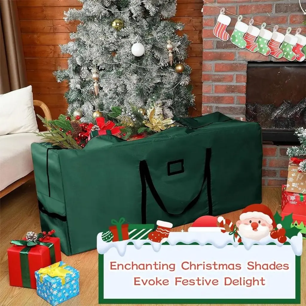This large-capacity Christmas tree storage bag measures 50×16×20 inches and can easily hold 6-7.5 feet artificial Christmas trees, wreaths, Christmas gift boxes and holiday lights, among other items. Made of high-density PE fabric, it has been comprehensively upgraded to be beautiful, sturdy and tear-resistant. It is equipped with a large opening design and two handles for convenient use. The bidirectional zipper enhances load-bearing capacity and tear resistance. It is waterproof and can protect items from dust, insects, moisture and ultraviolet rays. It is lighter and more space-saving than storage boxes. The heavy-duty double handles at both ends are easy to move, and the spacious opening makes it convenient to place the disassembled Christmas tree. When not in use, it can be folded for storage. It has a fashionable appearance. Besides storing Christmas trees, it can also be used to store quilts, blankets, and as a dust cover for bicycles, etc. It is suitable for storing various large items.