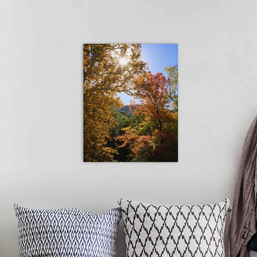Vertical, big photograph of the tops of large sycamore and maple trees with fall foliage, in Garden Canyon, Coronado National forest. The sun in shining brightly over the Huachuca Mountains in the background.