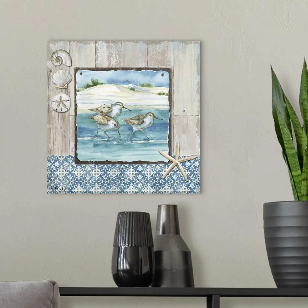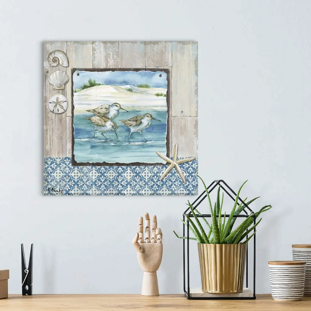 Square beach decor with sandpipers and seashells in blue and brown tones.