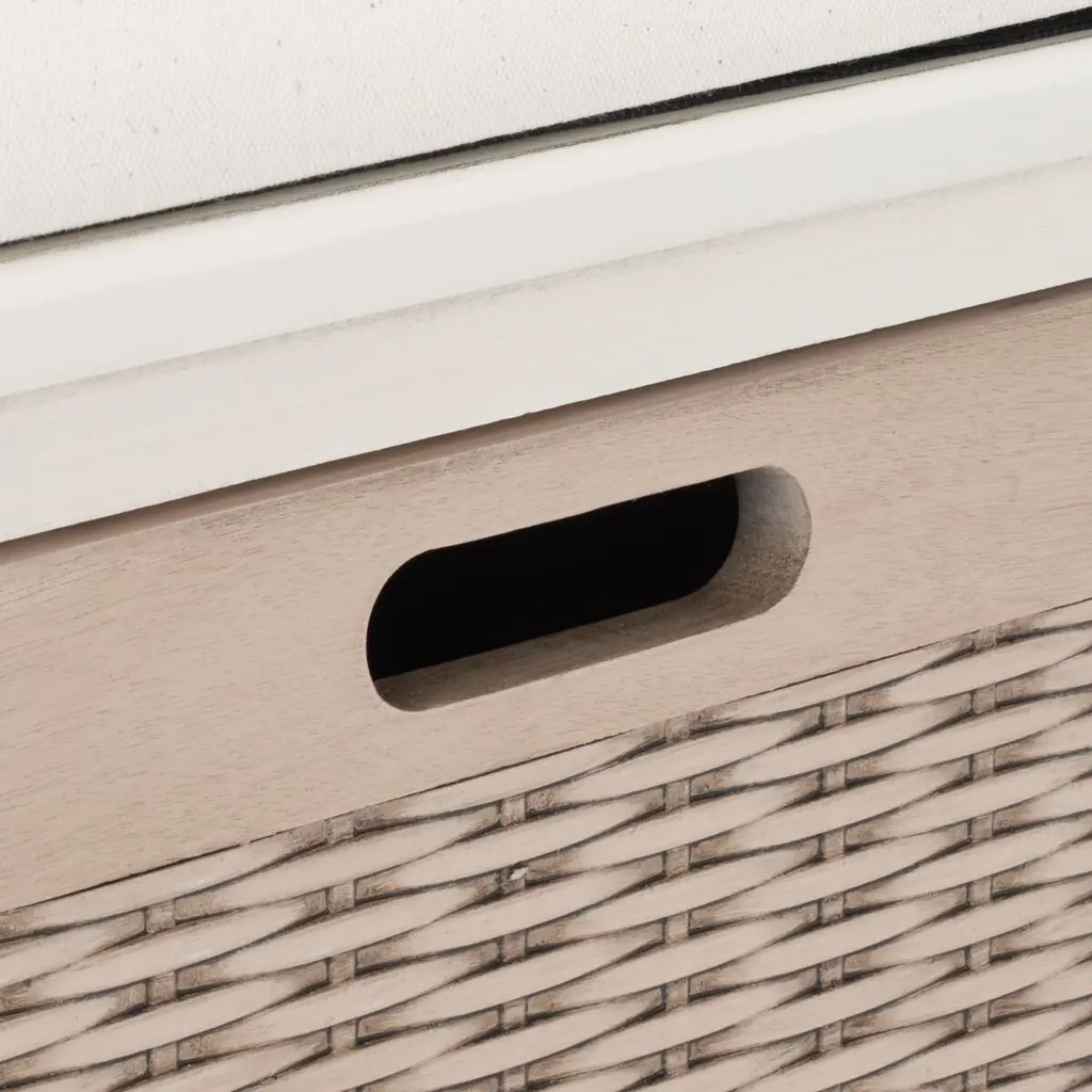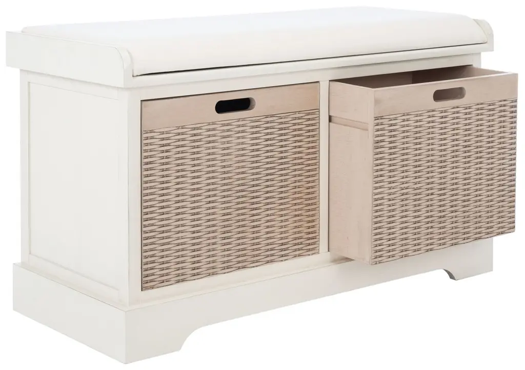 The Sylibeth Cushion Storage Bench performs double duty as a stylish storage solution and perfect seating in an entryway or mud room. Sylibeth gives your decor a touch of contemporary farmhouse charm with its spacious basket drawers.
