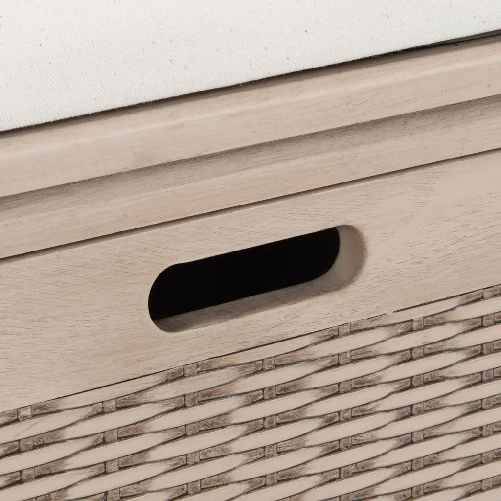 The Sylibeth Cushion Storage Bench performs double duty as a stylish storage solution and perfect seating in an entryway or mud room. Sylibeth gives your decor a touch of contemporary farmhouse charm with its spacious basket drawers.
