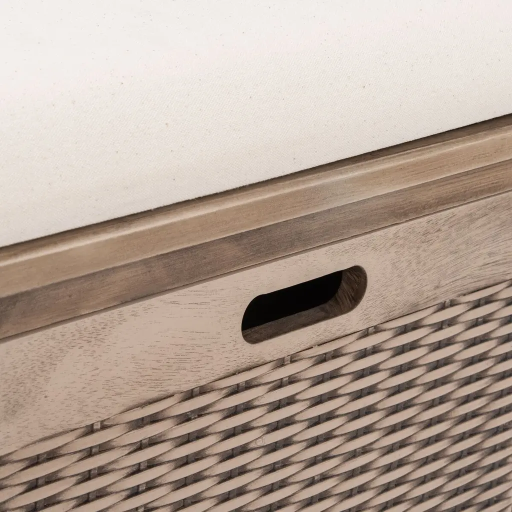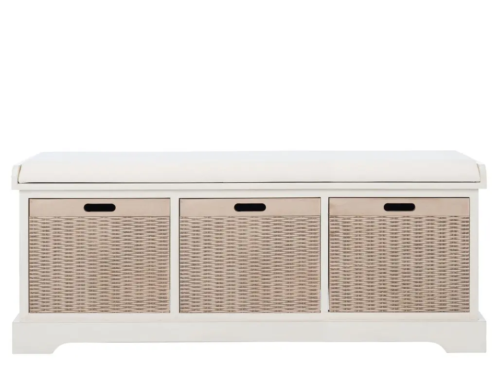 The Sylibeth Cushion Storage Bench performs double duty as a stylish storage solution and perfect seating in an entryway or mud room. Sylibeth gives your decor a touch of contemporary farmhouse charm with its spacious basket drawers.