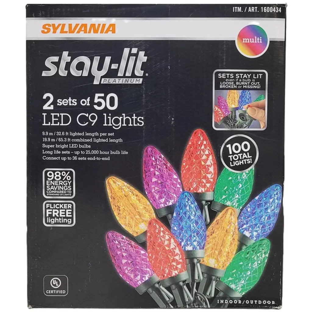 The Sylvania Stay-Lit 2 Sets of 50 C9 Faceted LED Christmas Lights, Multicolor, brighten your home with sparkling light. Sets are designed with advanced technology that keep the sets lit even if bulbs are burnt out, broken, loose, or even missing. Each strand features flicker free technology providing warm holiday illumination. Remains cool to the touch even when lit while using less energy than incandescent bulbs. Product Details: Sylvania Stay-lit 50-Count LED Faceted C9 Lights (2 sets), Multi-Color: Red, Green, Blue, Purple & Orange. String lights for indoor/outdoor use. Long life sets - up to 25,000 hour bulb life. 9.9 m / 32.6 ft lighted length (Get 65.3ft). Stays lit even if bulb is loose, burnt out, broken or missing. Super Bright LED Lights. Connect up to 30 Sets. UL Listed. Energy Star.