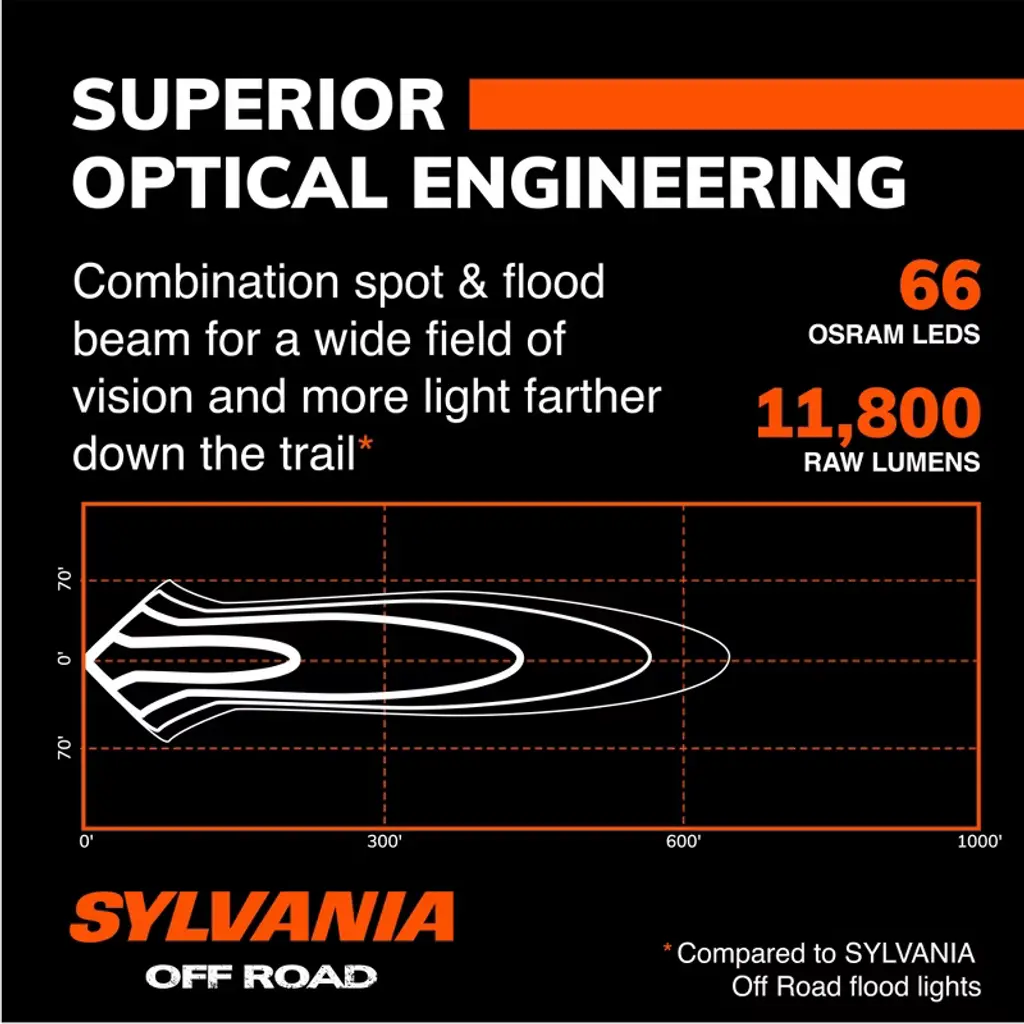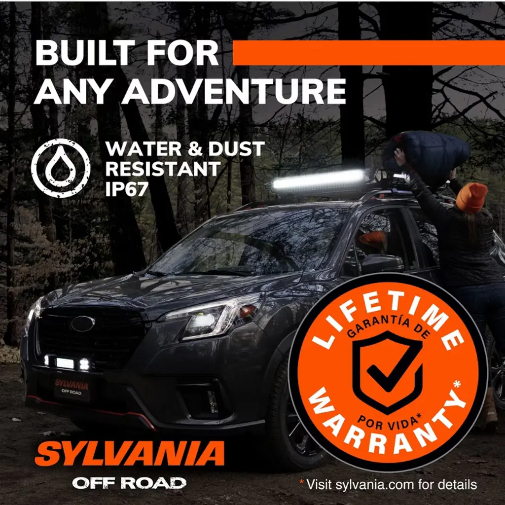 Harness the power of SYLVANIA’s brightest off-road light series when you equip your vehicle with SYLVANIA Ultra LED Off Road lights. Bring adventure out of the shadows with up to 11800 raw lumens protected by a water-resistant design, helping you light up the trail time and time again. SYLVANIA Ultra LED Off Road combo light couples the power of spot and flood beams for a long distance reach and wide-angle coverage for the ultimate visibility on the trail. Ultimate off road visibility is just a DIY installation away with SYLVANIA’s Ultra LED Off Road Lights, protected by a lifetime limited warranty.SYLVANIA has over 100 years of superior optical engineering - an expertise you feel in every twist and turn of your adventure, backed by a lifetime limited warranty for added peace of mind.