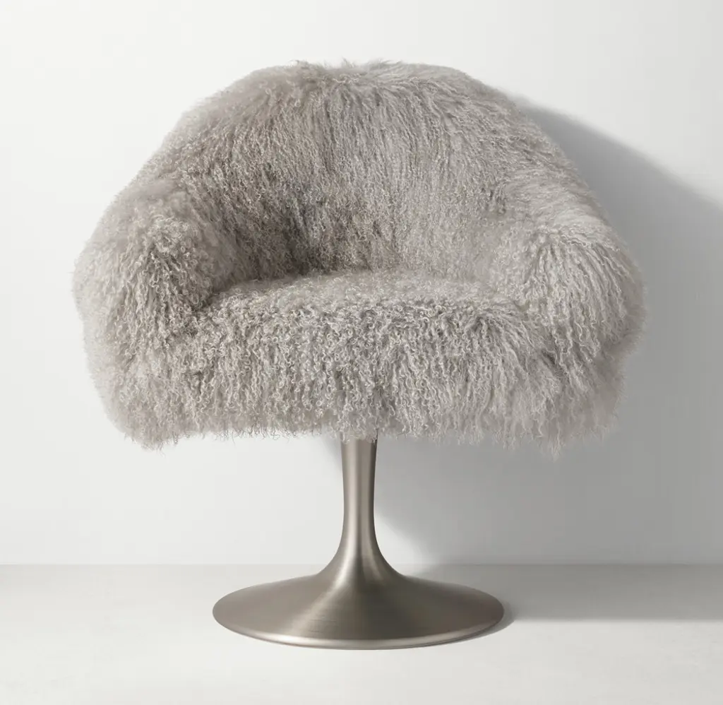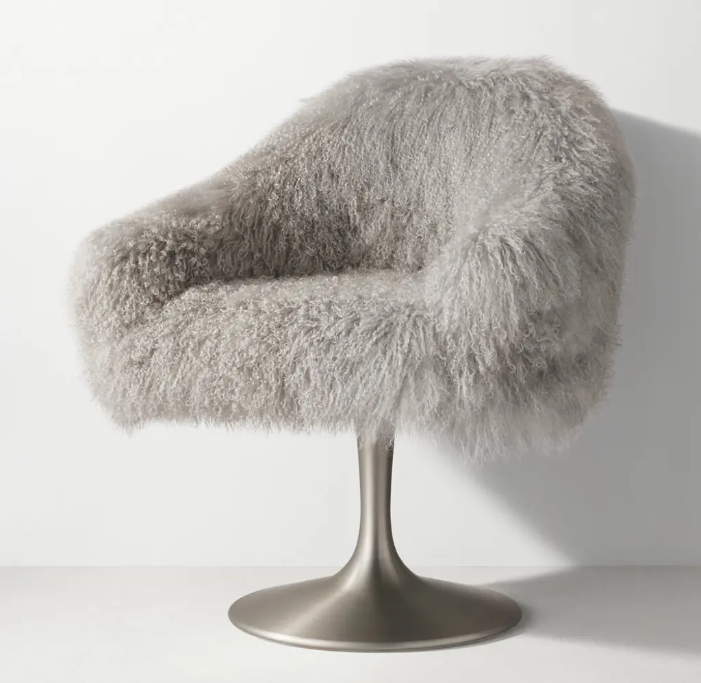 The perfect perch. Offering a feminine interpretation of a midcentury desk chair, Sylvie's bucket-style seat is upholstered in luxurious Mongolian lamb and sits atop a graceful metal pedestal.
