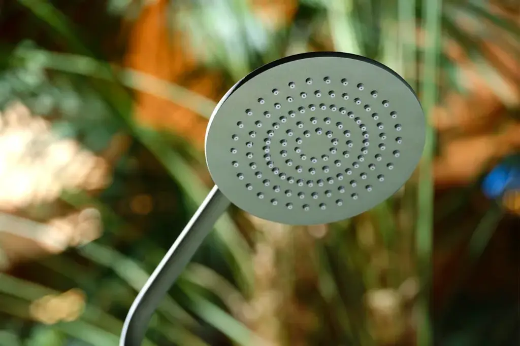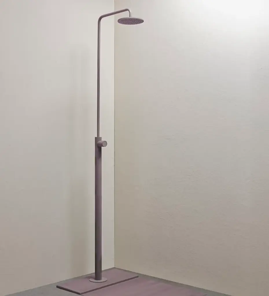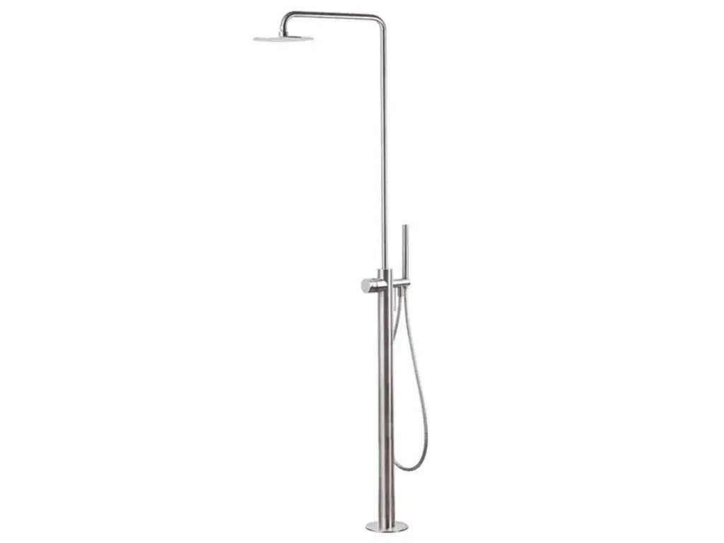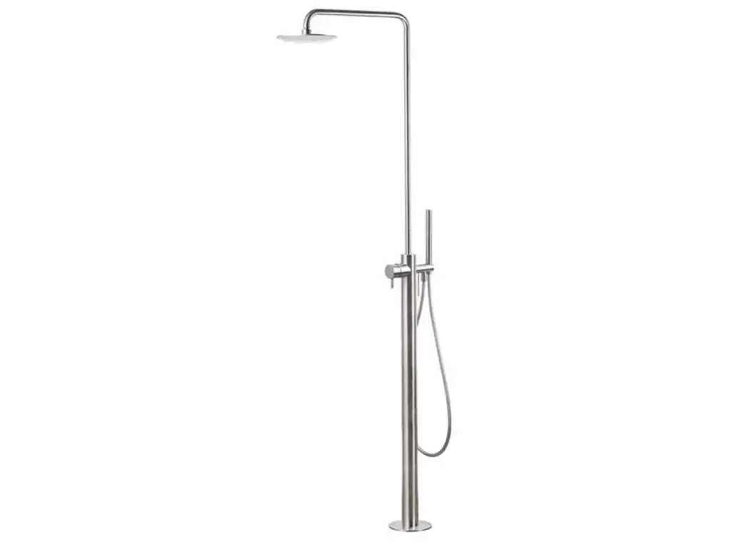 SYNTH |floor standing shower panel with overhead shower ø200 mm. Complete fixing base. - stainless steel AISI 316 LAvailable finishes: Brushed stainless steel, Deep grey inox, ceraMINA colors.Synth, harmonizing water. Water temperature and flow rate are like volume and melody tone which should be carefully regulated in order to reach the ideal comfort. The tap control is enriched with incisions and grooves which allow to regulate movements. A smaller, restricted size is essential and proportionally light. The Synth collection made entirely of stainless steel consists of several proposals for basin, shower and bathtub. It likes matching vintage mood with contemporary projects. The collection is also available in a CeraMINA version: a palette of ceramic colours with pearl shades designed to find the most suitable shade for every project.From pearl black to calm green, passing through sweet blue, light rose, rich brown, vivid orange and golden yellow.