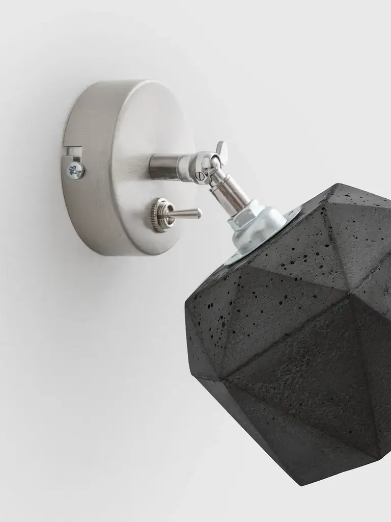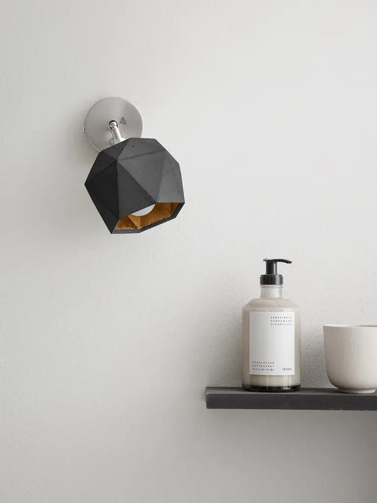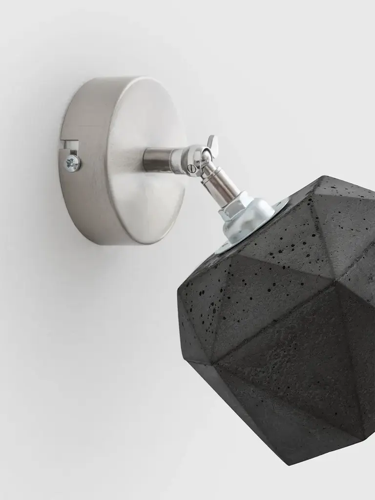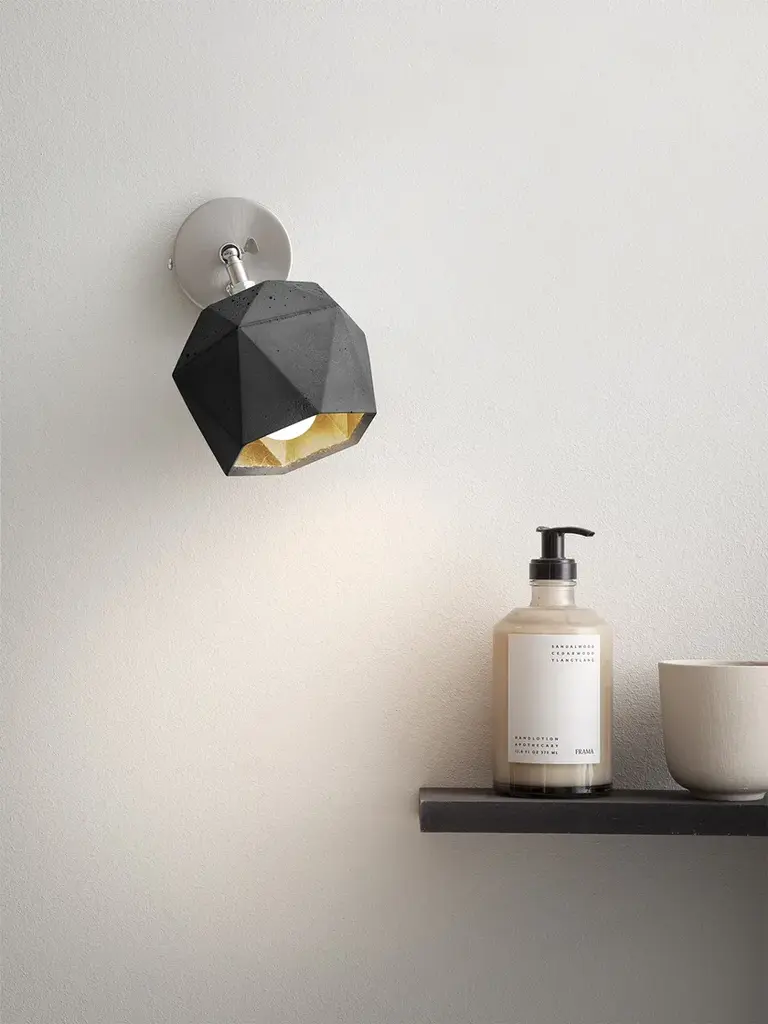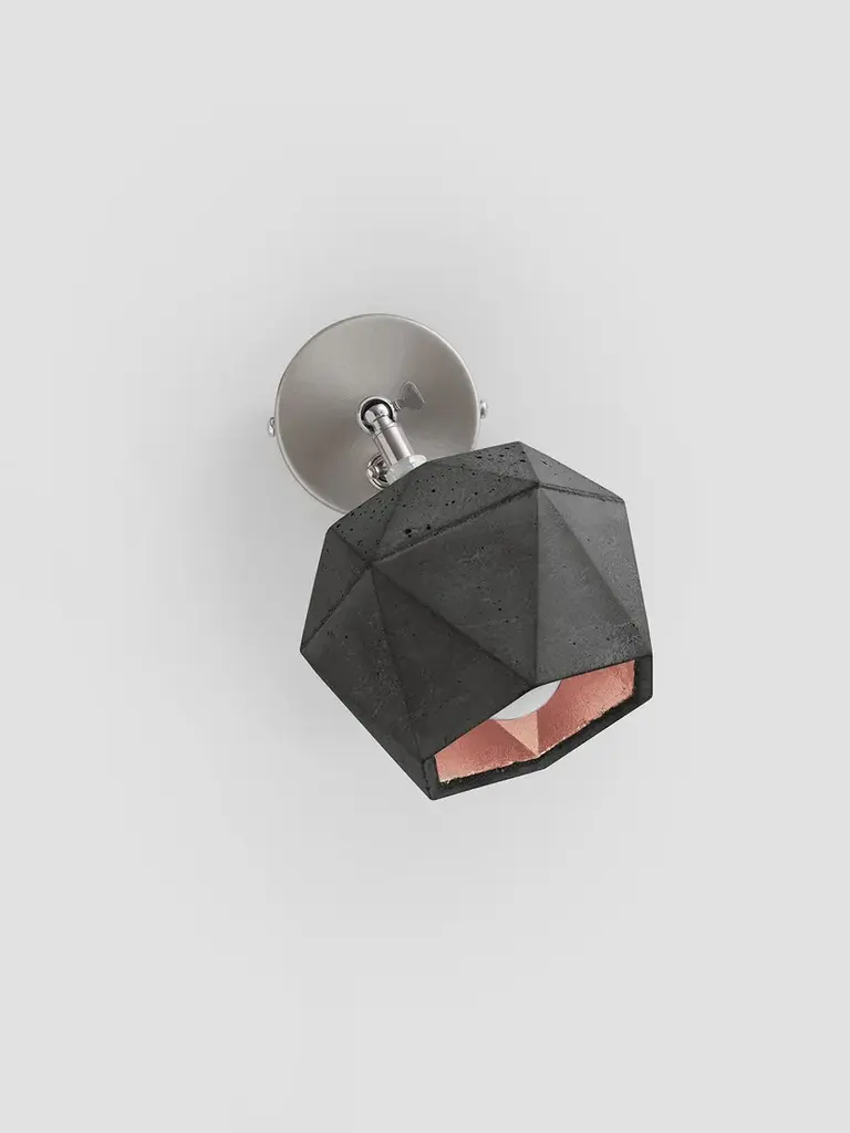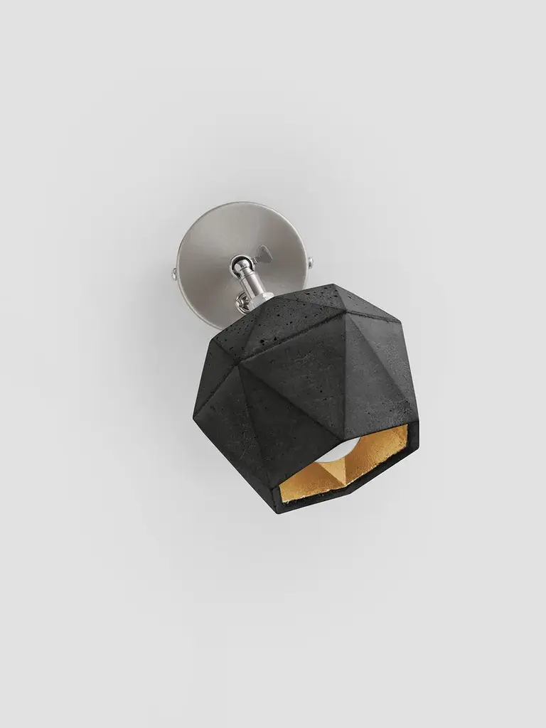 [T2]dark Spot Wall Light Triangle - dark grey concrete with gold, silver or copper plating on the inside - handmade by GANTlights in Berlin. The wall lamp works great as a solitary "eye-catcher" spot light or as a bed light. Alternatively it could be combined in a series along a wall for illuminating a picture gallery for example. Due to its minimalistic design and the contrasting materials, the lamp is modern and timeless at the same time and can therefore be combined with any style. Included: The handmade lamp shade is delivered ready to install with an E14 mount, mounting hardware and steel canopy. Watts / beam angle: 60W / 110°The lamp requires an E14 bulb (please note that the bulb is not included).