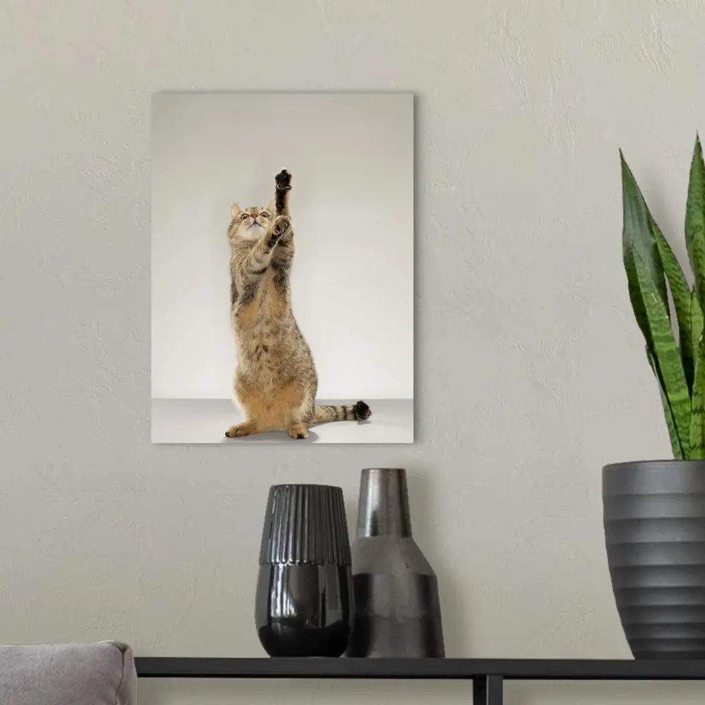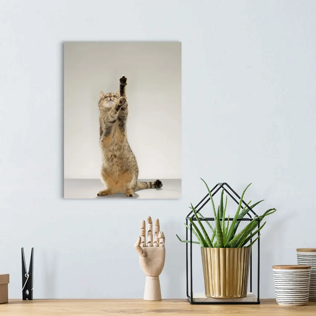 Tabby cat standing on hind legs with stretching out paw wall art for home and office decor. Discover canvas art prints, photos, mural, big canvas art and framed wall art in GreatBigCanvas.com's varied collections.