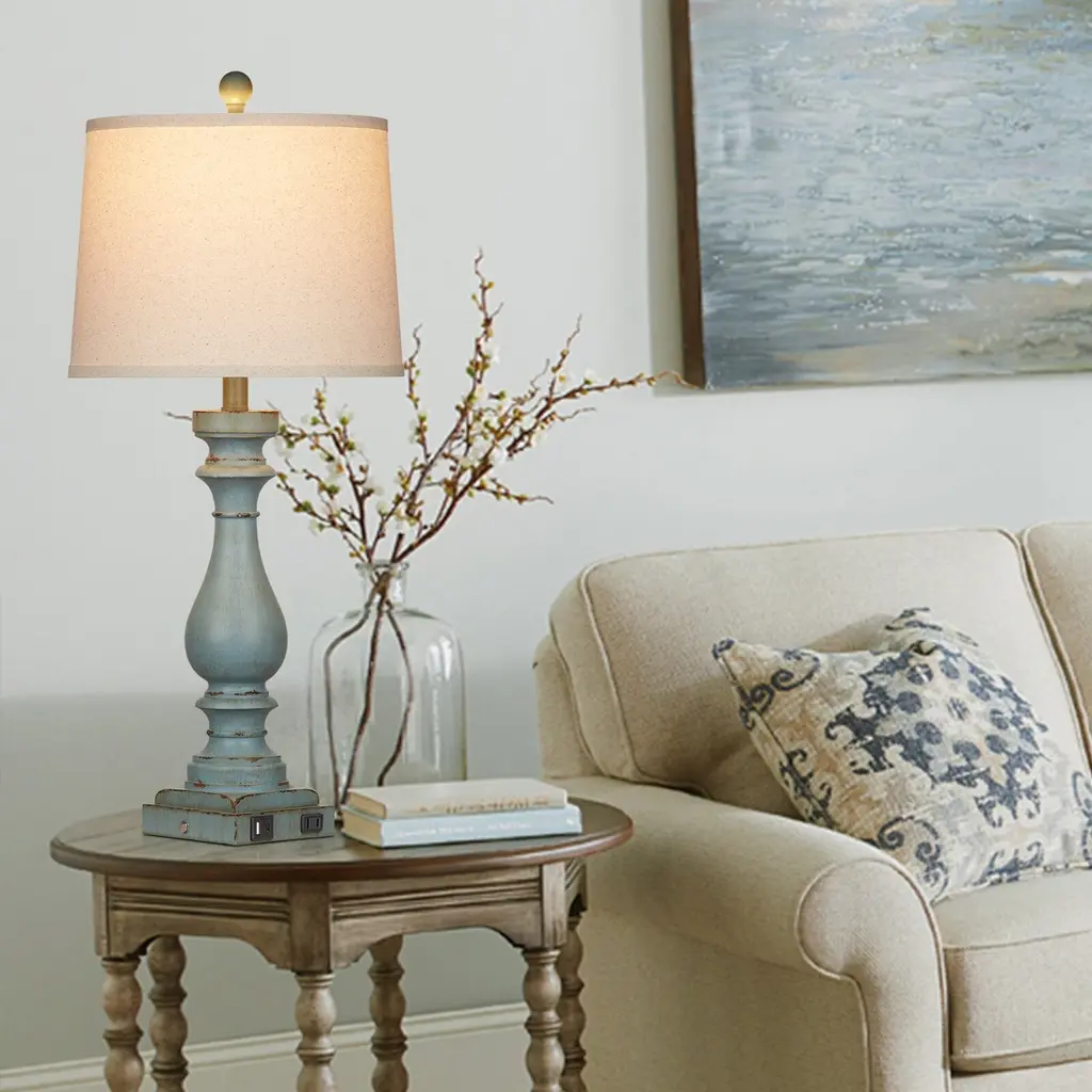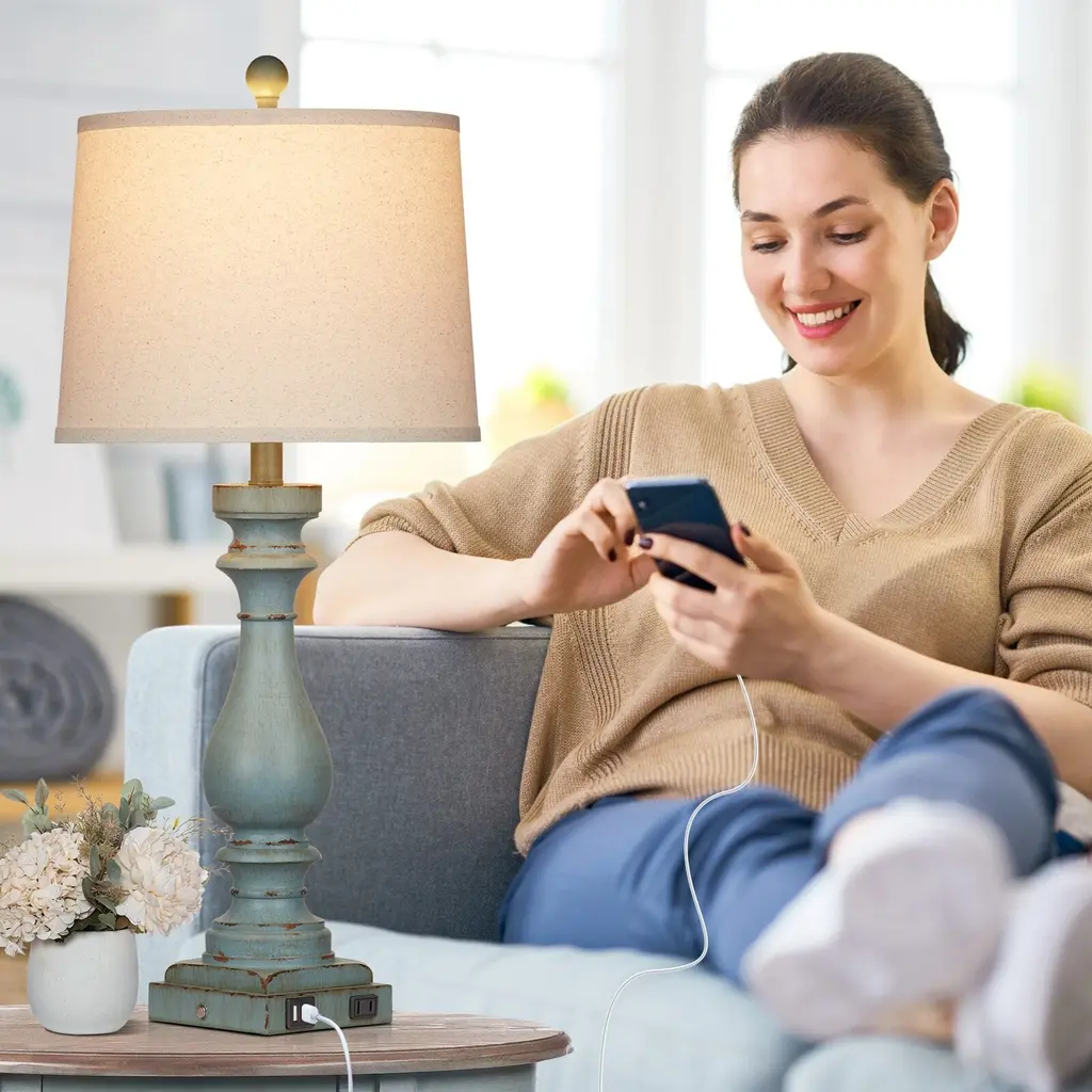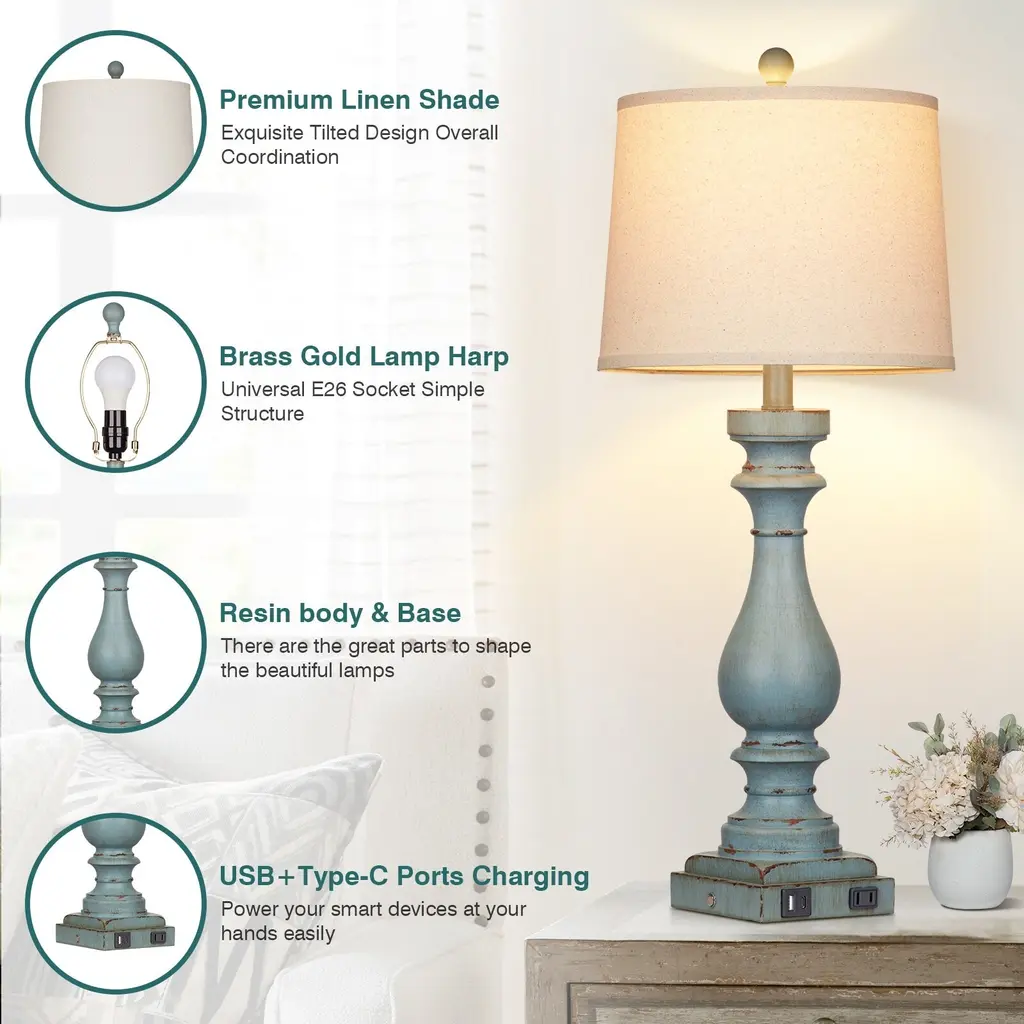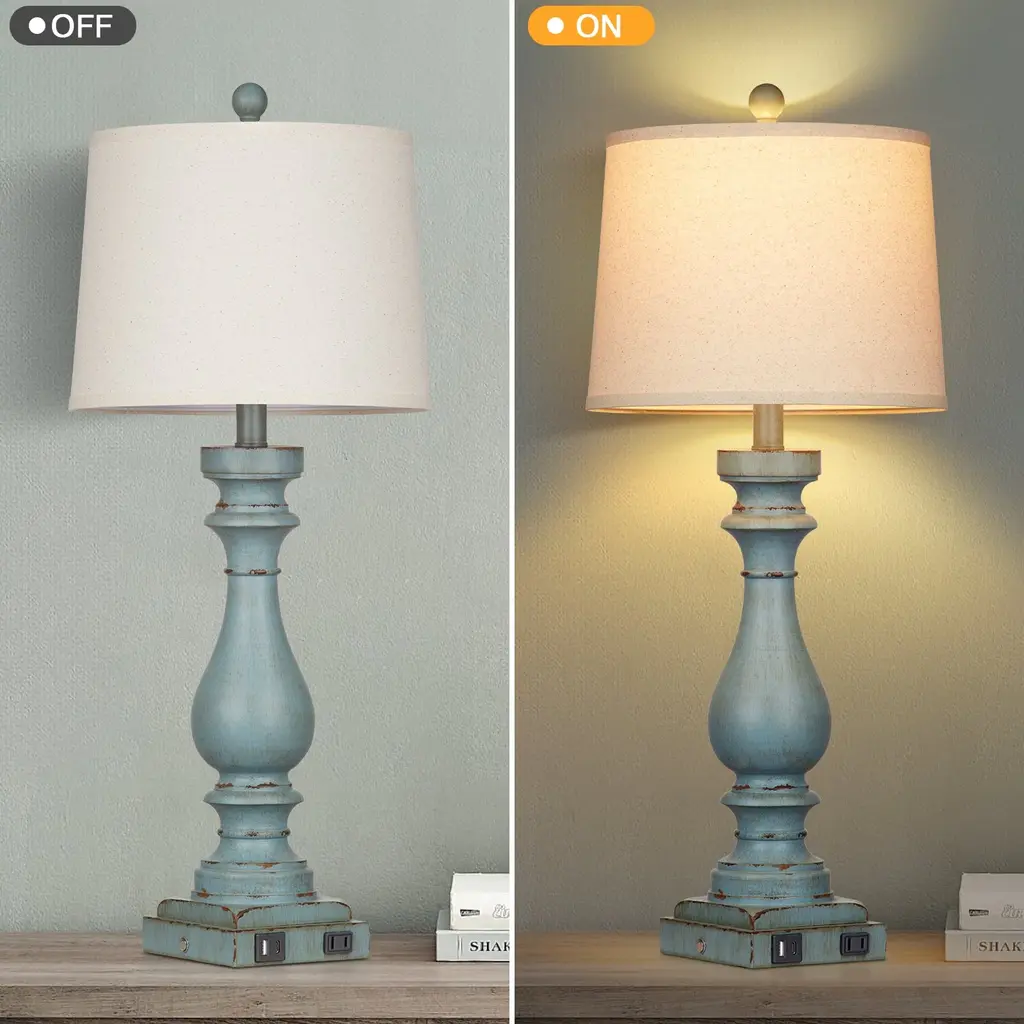 The product is a set of 2 resin table lamps. Its overall appearance is drop style. The design idea is from royal court. The vintage elements makes the decoration more historical. And it also adopts more modern technology. For example, its switch is placed on the lamp base. The switch supports 3-Way dimming. You will get the different lighting experience according to your touch the switch with different times. The light level will be adjusted from low, medium to high. About LED bulbs(800 Lumens, 2700K, ), it is included. It's featured with eye protection. And the lamp holder is standard E26. It's conveniently to replace it with more various bulbs by your real needs. Furthermore, the lamp base integrates practical charging ports and AC outlet. It can power your smart device more conveniently at your hand. You just need the USB or type-C data cable and don't have to carry the adapter all the time. Additionally, the lamp base is square, and its bottom comes with a mat. It is both non-slip and silent. That can improve your usage experience when you move it at night. Vintage and modern elements combines the new appearance. The new lamp appearance makes life newer and better.Overview of features:
