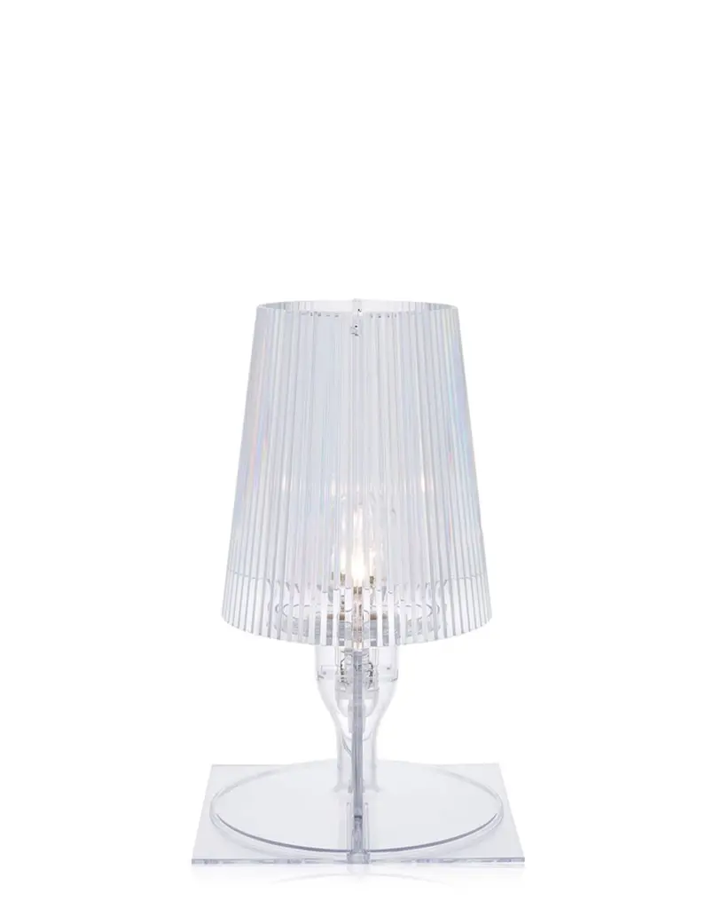 The classic icon of the bedside lamp is revisited by Kartell's technology to become an industrial product in a variety of colour shades. The shape of Take is the result of the joining of two specular parts: two flat, rectangular sheets which, from being two-dimensional at the centre, take on the shape and volume of a "semi-lamp". The internal pleating of the diffuser embellishes the object, creating, when lit, a play of reflections.