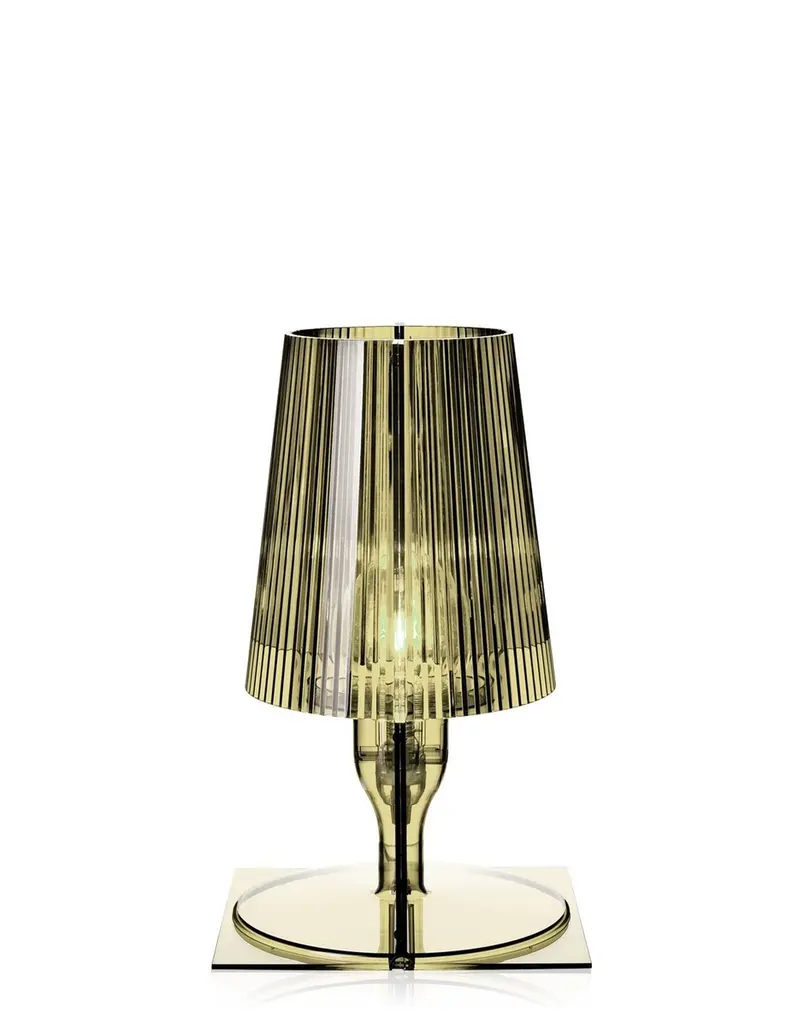 The classic icon of the bedside lamp is revisited by Kartell's technology to become an industrial product in a variety of colour shades. The shape of Take is the result of the joining of two specular parts: two flat, rectangular sheets which, from being two-dimensional at the centre, take on the shape and volume of a "semi-lamp". The internal pleating of the diffuser embellishes the object, creating, when lit, a play of reflections.