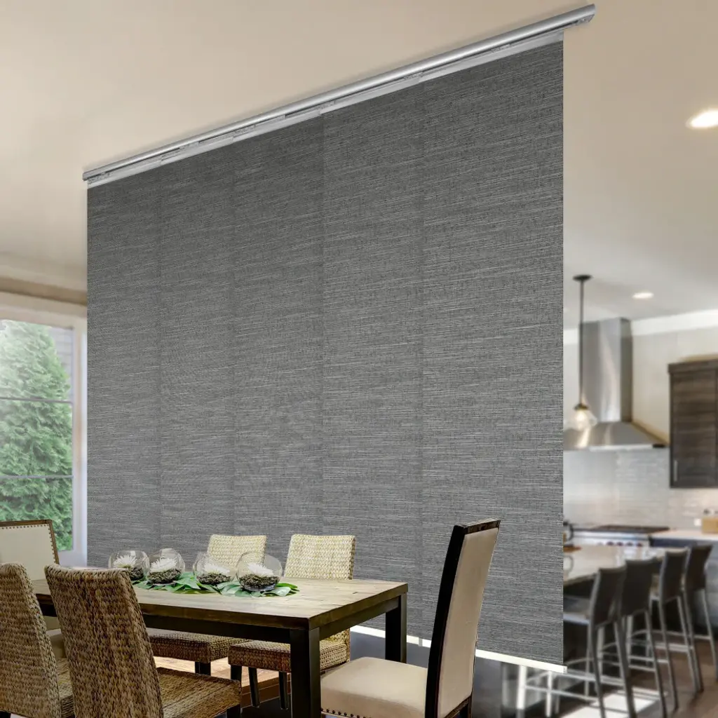 Central Design Products is pleased to introduce a new innovative panel track that offers easy 2-way installation, adding an alluring style and refined touch to your home decor. The single rail design of the track is sleek, compact, and reduces the overall footprint and weight of the installation, eliminating bulky, intrusive window treatments. Adjusting the panel height is a breeze � simply trim the panel, re-attach the liner, and install the panel weight. Detailed instructions are included.The panel track also features a patented slider design, made with aluminum and fitted with bearings that allow for durable and smooth operation. The sliders are stacked closer together than conventional panel tracks, reducing light bleed coming from the gaps between panels. This track has endless uses from dividing rooms, garages, offices, and closets to decorating windows and patios. Available in larger sizes including 8, 10, and 12 panels. Extends from 58-110� wide. Each panel measures 23.5" wide and 91.5" tall, with a total installation height of 94" (includes the 2.5" rail track). The track can be wall or ceiling mounted. The panels can stack on the left or the right. The clearance from the wall is extendable from 1.25� to 3.25� and projection from the wall is extendable from 3� to 4.25�. Tahla panel is made from 70% Polyester 30% Acrylic, with a blackout shade.